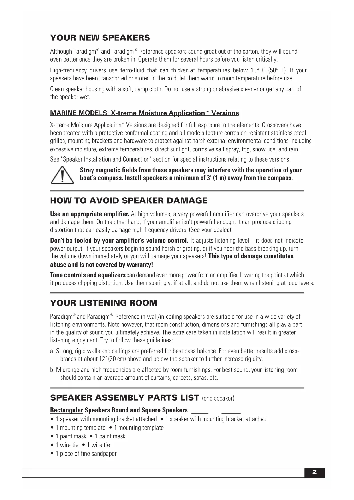 Versions are designed for full exposure to the elements. Crossovers have been treated with a protective conformal coating and all models feature corrosion-resistant stainless-steel grilles, mounting brackets and hardware to protect against harsh external environmental conditions including excessive moisture, extreme temperatures, direct sunlight, corrosive salt spray, fog, snow, ice, and rain. See "Speaker Installation and Connection" section for special instructions relating to these versions. Stray magnetic fields from these speakers may interfere with the operation of your boat’s compass. Install speakers a minimum of 3' (1 m) away from the compass.