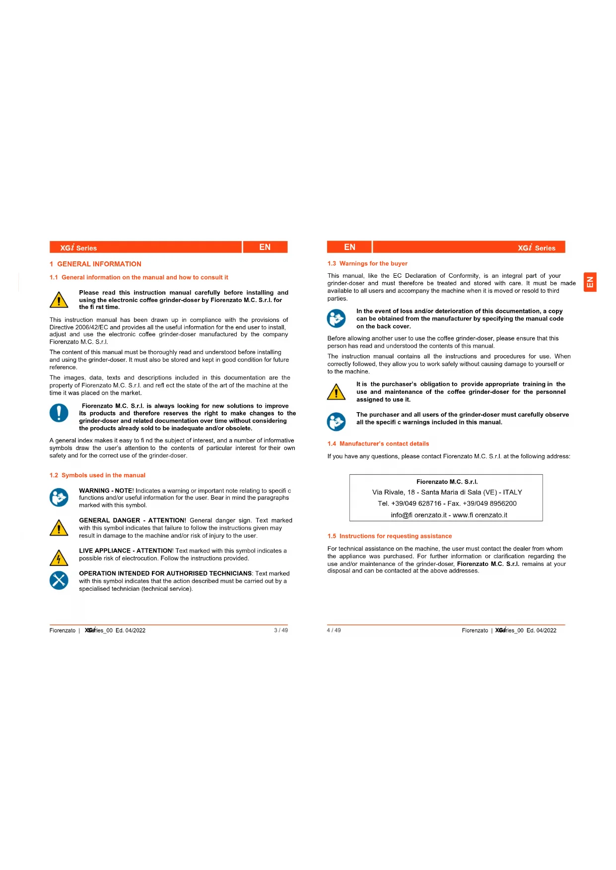 For technical assistance on the machine, the user must contact the dealer from whom the appliance was purchased. For further information or clarifi cation regarding the use and/or maintenance of the grinder-doser, Fiorenzato M.C. S.r.l. remains at your disposal and can be contacted at the above addresses.EN Fiorenzato | Series_00 Ed. 04/2022 5 / 49 Series