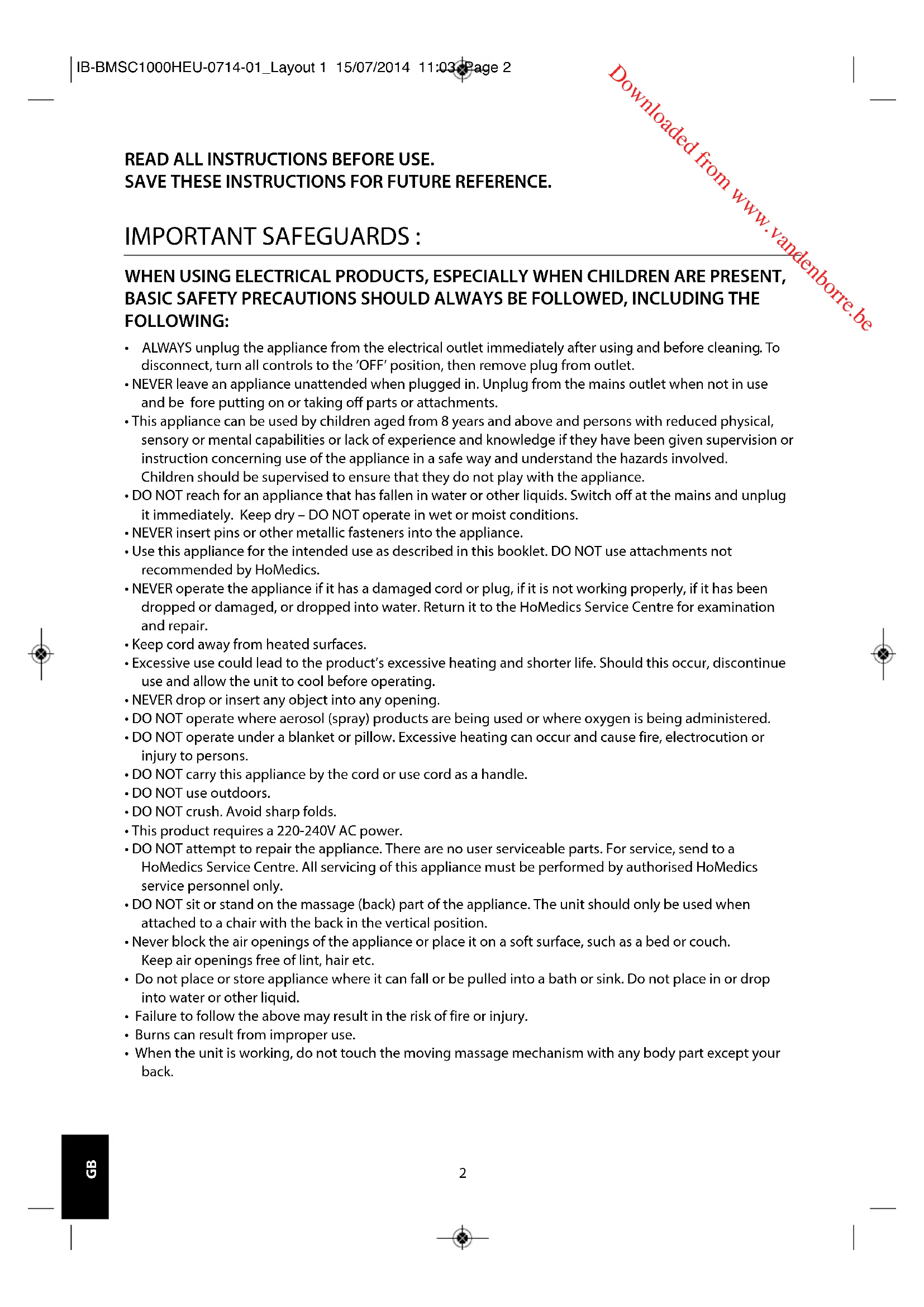 PRODUCT FEATURES : IB-BMSC1000HEU-0714-01_Layout 1 15/07/2014 11:03 Page 4 Downloaded from www.vandenborre.be5 INSTRUCTIONS FOR USE : IMPORTANT - Preparing the appliance for use The Shiatsu Massager comes with a screw located on the back of the unit to protect the massage mechanism during shipment, which must be removed before the first use to allow the shiatsu feature to function. Use the provided Allen key. Then, properly dispose of the screw. Warning - Failure to remove screw may cause permanent damage to the massager. Error: all remote control LEDS flash for a few seconds. Cause: massager overloaded. Solution: ensure the allen key bolt/screw has been removed from back of the massage cushion (using the allen key included). Should the condition continue after this please contact your HoMedics service centre. NOTE: complete steps 1 to 3 before switching the appliance on at the mains.