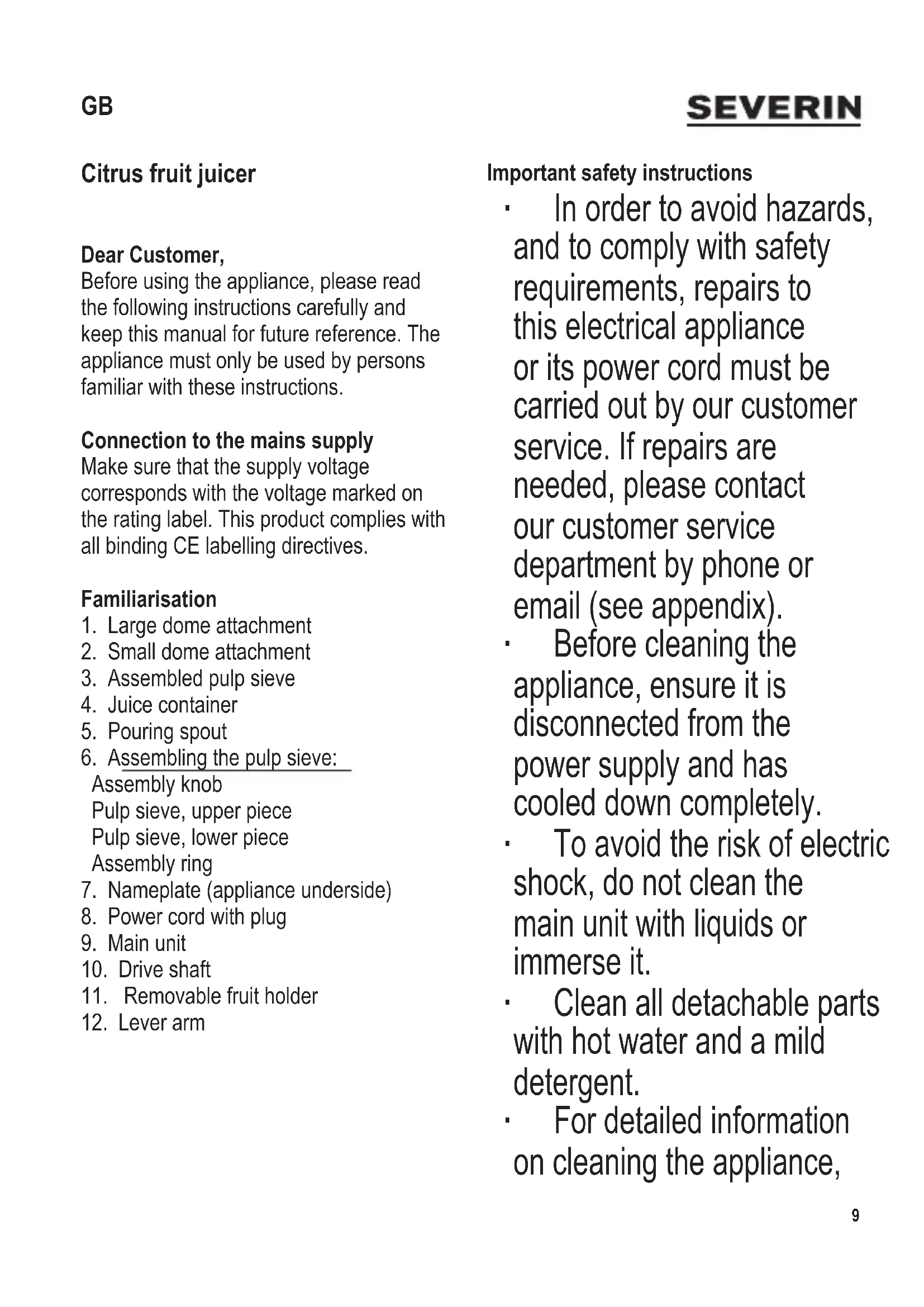Citrus fruit juicer Dear Customer, Before using the appliance, please read the following instructions carefully and keep this manual for future reference. The appliance must only be used by persons familiar with these instructions. Connection to the mains supply Make sure that the supply voltage corresponds with the voltage marked on the rating label. This product complies with all binding CE labelling directives. Familiarisation