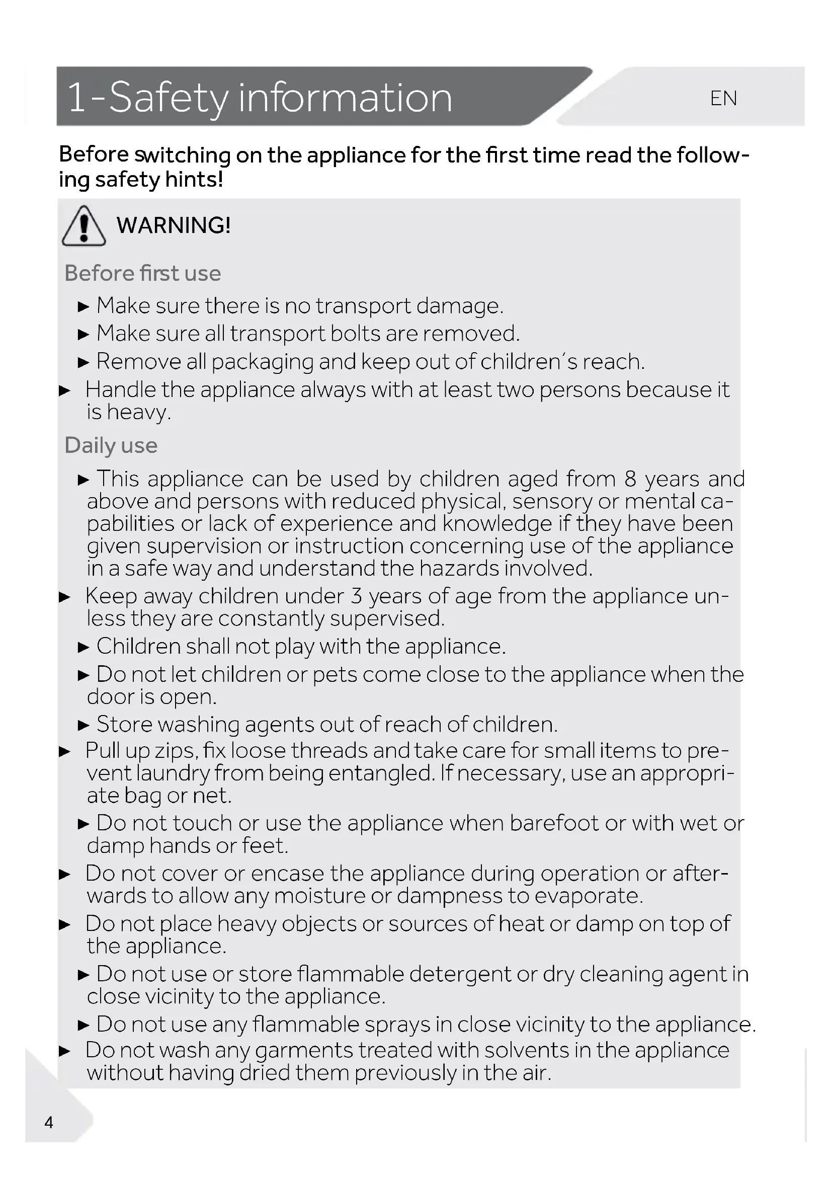 Before s witching on the appliance for the rst time read the follow- ing safety hints! WARNING! Before r st use ▶ Make sure there is no transport damage. ▶ Make sure all transport bolts are removed. ▶ Remove all packaging and keep out of children´s reach. ▶ Handle the appliance always with at least two persons because it is heavy. Daily use ▶ This appliance can be used by children aged from 8 years and above and persons with reduced physical, sensory or mental ca- pabilities or lack of experience and knowledge if they have been given supervision or instruction concerning use of the appliance in a safe way and understand the hazards involved. ▶ Keep away children under 3 years of age from the appliance un- less they are constantly supervised. ▶ Children shall not play with the appliance. ▶ Do not let children or pets come close to the appliance when the door is open. ▶ Store washing agents out of reach of children. ▶ Pull up zips, x loose threads and take care for small items to pre- vent laundry from being entangled. If necessary, use an appropri- ate bag or net. ▶ Do not touch or use the appliance when barefoot or with wet or damp hands or feet. ▶ Do not cover or encase the appliance during operation or after- wards to allow any moisture or dampness to evaporate. ▶ Do not place heavy objects or sources of heat or damp on top of the appliance. ▶ Do not use or store flammable detergent or dry cleaning agent in close vicinity to the appliance. ▶ Do not use any flammable sprays in close vicinity to the appliance. ▶ Do not wash any garments treated with solvents in the appliance without having dried them previously in the air.EN 1-Safet y information