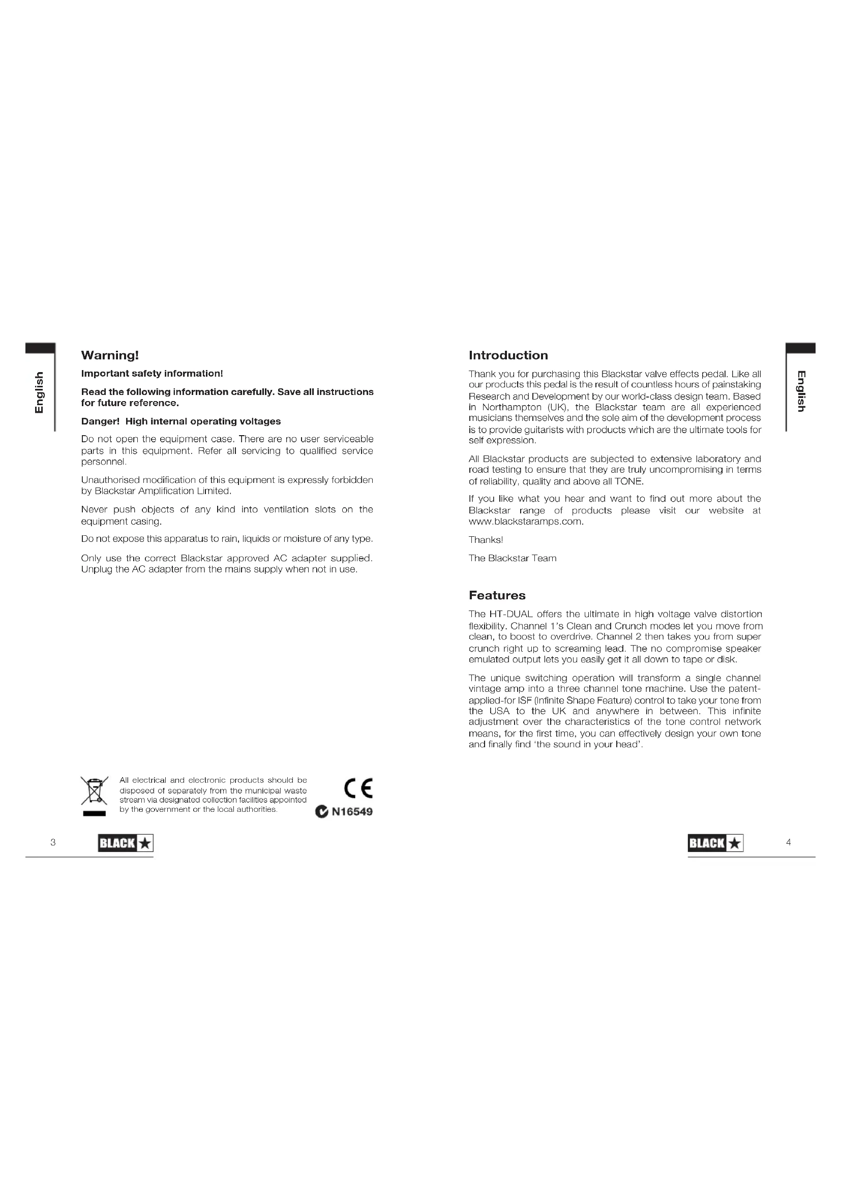 Introduction Thank you for purchasing this Blackstar valve effects pedal. Like all our products this pedal is the result of countless hours of painstaking Research and Development by our world-class design team. Based in Northampton (UK), the Blackstar team are all experienced musicians themselves and the sole aim of the development process is to provide guitarists with products which are the ultimate tools for self expression. All Blackstar products are subjected to extensive laboratory and road testing to ensure that they are truly uncompromising in terms of reliability, quality and above all TONE. If you like what you hear and want to find out more about the Blackstar range of products please visit our website at www.blackstaramps.com. Thanks! The Blackstar Team Features The HT-DUAL offers the ultimate in high voltage valve distortion flexibility. Channel 1’s Clean and Crunch modes let you move from clean, to boost to overdrive. Channel 2 then takes you from super crunch right up to screaming lead. The no compromise speaker emulated output lets you easily get it all down to tape or disk. The unique switching operation will transform a single channel vintage amp into a three channel tone machine. Use the patent- applied-for ISF (Infinite Shape Feature) control to take your tone from the USA to the UK and anywhere in between. This infinite adjustment over the characteristics of the tone control network means, for the first time, you can effectively design your own tone and finally find ‘the sound in your head’. English