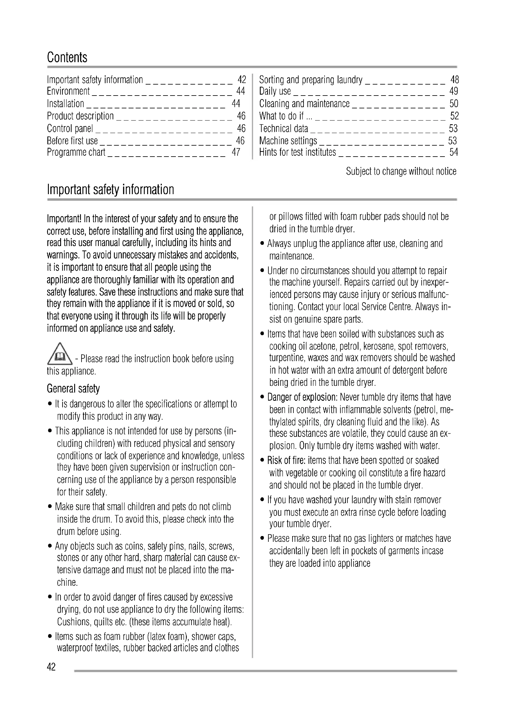- Efficienza di condensa (corretto con umidità finale) du- rante il ciclo Cotone Asciugatura Armadio con carico nominale e mezzo carico Tutti i cicli devono essere controllati in conformità alla EN 61121 (Asciugatrici per uso domestico – Metodi di misu- razione della prestazione). 41Contents Important safety information _ _ _ _ _ _ _ _ _ _ _ _ 42 Environment _ _ _ _ _ _ _ _ _ _ _ _ _ _ _ _ _ _ _ _ 44 Installation _ _ _ _ _ _ _ _ _ _ _ _ _ _ _ _ _ _ _ _ 44 Product description _ _ _ _ _ _ _ _ _ _ _ _ _ _ _ _ 46 Control panel _ _ _ _ _ _ _ _ _ _ _ _ _ _ _ _ _ _ _ 46 Before first use _ _ _ _ _ _ _ _ _ _ _ _ _ _ _ _ _ _ _ 46 Programme chart _ _ _ _ _ _ _ _ _ _ _ _ _ _ _ _ _ 47 Sorting and preparing laundry _ _ _ _ _ _ _ _ _ _ _ 48 Daily use _ _ _ _ _ _ _ _ _ _ _ _ _ _ _ _ _ _ _ _ _ 49 Cleaning and maintenance _ _ _ _ _ _ _ _ _ _ _ _ _ 50 What to do if ... _ _ _ _ _ _ _ _ _ _ _ _ _ _ _ _ _ _ 52 Technical data _ _ _ _ _ _ _ _ _ _ _ _ _ _ _ _ _ _ _ 53 Machine settings _ _ _ _ _ _ _ _ _ _ _ _ _ _ _ _ _ _ 53 Hints for test institutes _ _ _ _ _ _ _ _ _ _ _ _ _ _ _ 54 Subject to change without notice Important safety information Important! In the interest of your safety and to ensure the correct use, before installing and first using the appliance, read this user manual carefully, including its hints and warnings. To avoid unnecessary mistakes and accidents, it is important to ensure that all people using the appliance are thoroughly familiar with its operation and safety features. Save these instructions and make sure that they remain with the appliance if it is moved or sold, so that everyone using it through its life will be properly informed on appliance use and safety. - Please read the instruction book before using this appliance. General safety