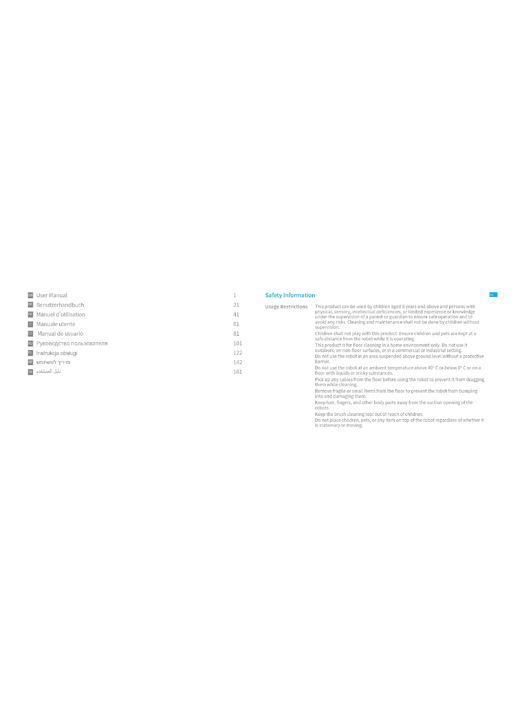 Usage Restrictions S a f e t y I n f o r m a t i o n This product can be used by children aged 8 years and above and persons with physical, sensory, intellectual deficiencies, or limited experience or knowledge under the supervision of a parent or guardian to ensure safe operation and to avoid any risks. Cleaning and maintenance shall not be done by children without supervision. Children shall not play with this product. Ensure children and pets are kept at a safe distance from the robot while it is operating. This product is for floor cleaning in a home environment only. Do not use it outdoors, on non-floor surfaces, or in a commercial or industrial setting. Do not use the robot in an area suspended above ground level without a protective barrier. Do not use the robot at an ambient temperature above 40° C or below 0° C or on a floor with liquids or sticky substances. Pick up any cables from the floor before using the robot to prevent it from dragging them while cleaning. Remove fragile or small items from the floor to prevent the robot from bumping into and damaging them. Keep hair, fingers, and other body parts away from the suction opening of the robots. Keep the brush cleaning tool out of reach of children. Do not place children, pets, or any item on top of the robot regardless of whether it is stationary or moving. User Manual Benutzerhandbuch Manuel d'utilisation Manuale utente Manual de usuario Руководство пользовател