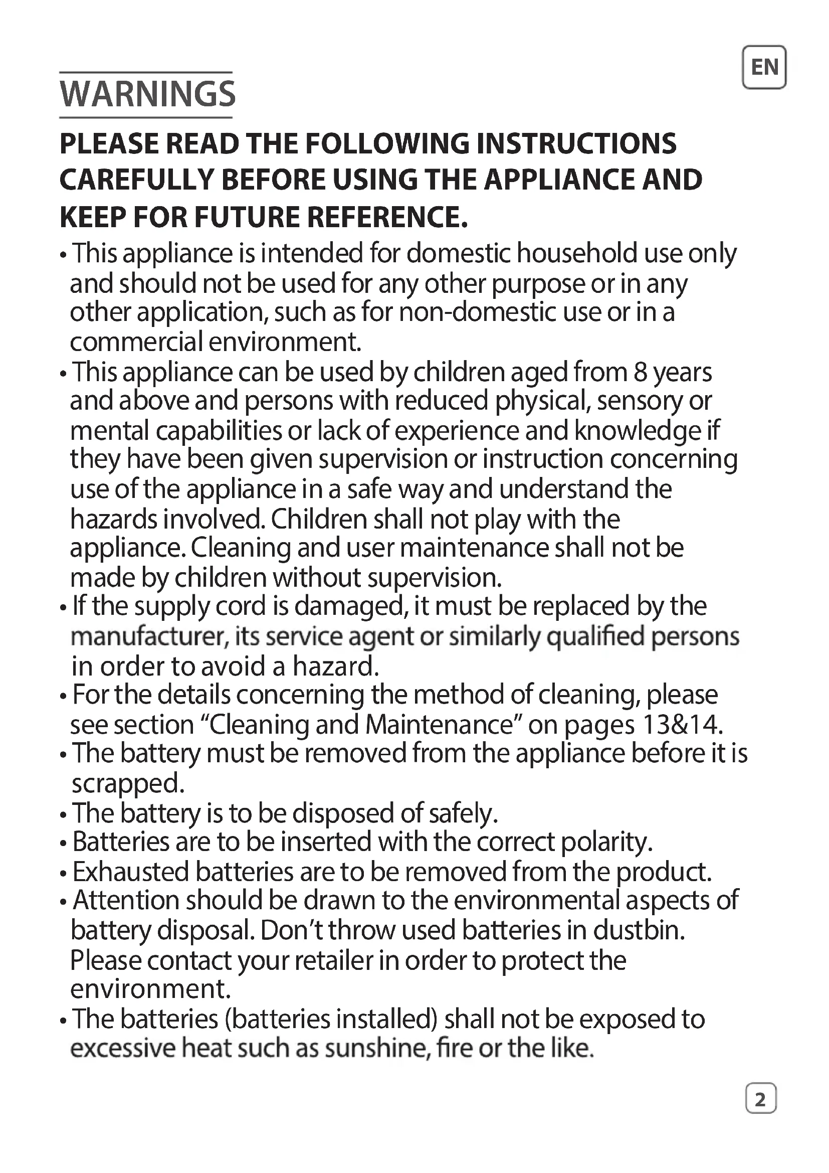 - This appliance is intended for domestic household use only and should not be used for any other purpose or in any other application, such as for non-domestic use or in a commercial environment.