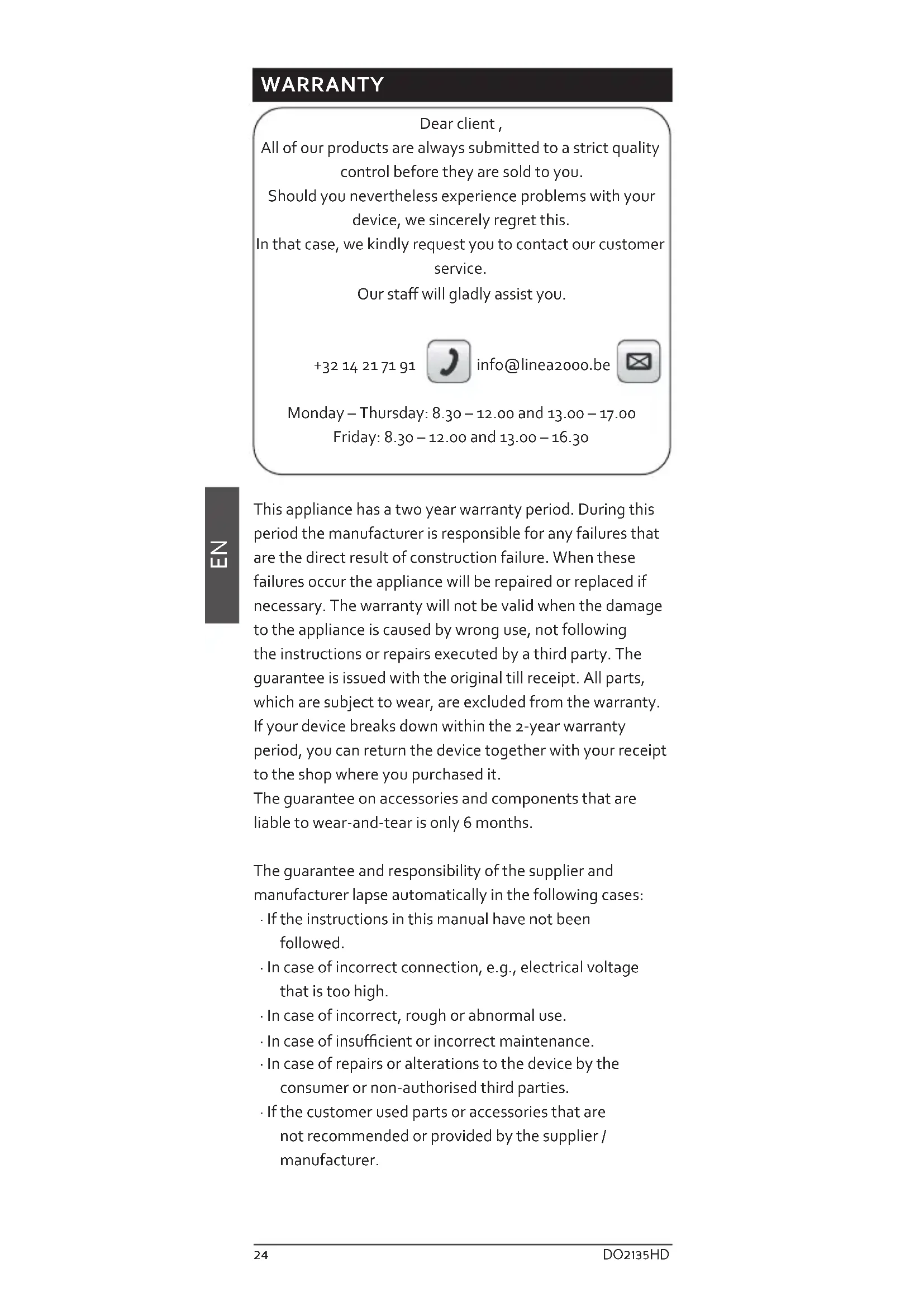 This appliance has a two year warranty period. During this period the manufacturer is responsible for any failures that are the direct result of construction failure. When these failures occur the appliance will be repaired or replaced if necessary. The warranty will not be valid when the damage to the appliance is caused by wrong use, not following the instructions or repairs executed by a third party. The guarantee is issued with the original till receipt. All parts, which are subject to wear, are excluded from the warranty. If your device breaks down within the 2-year warranty period, you can return the device together with your receipt to the shop where you purchased it.
