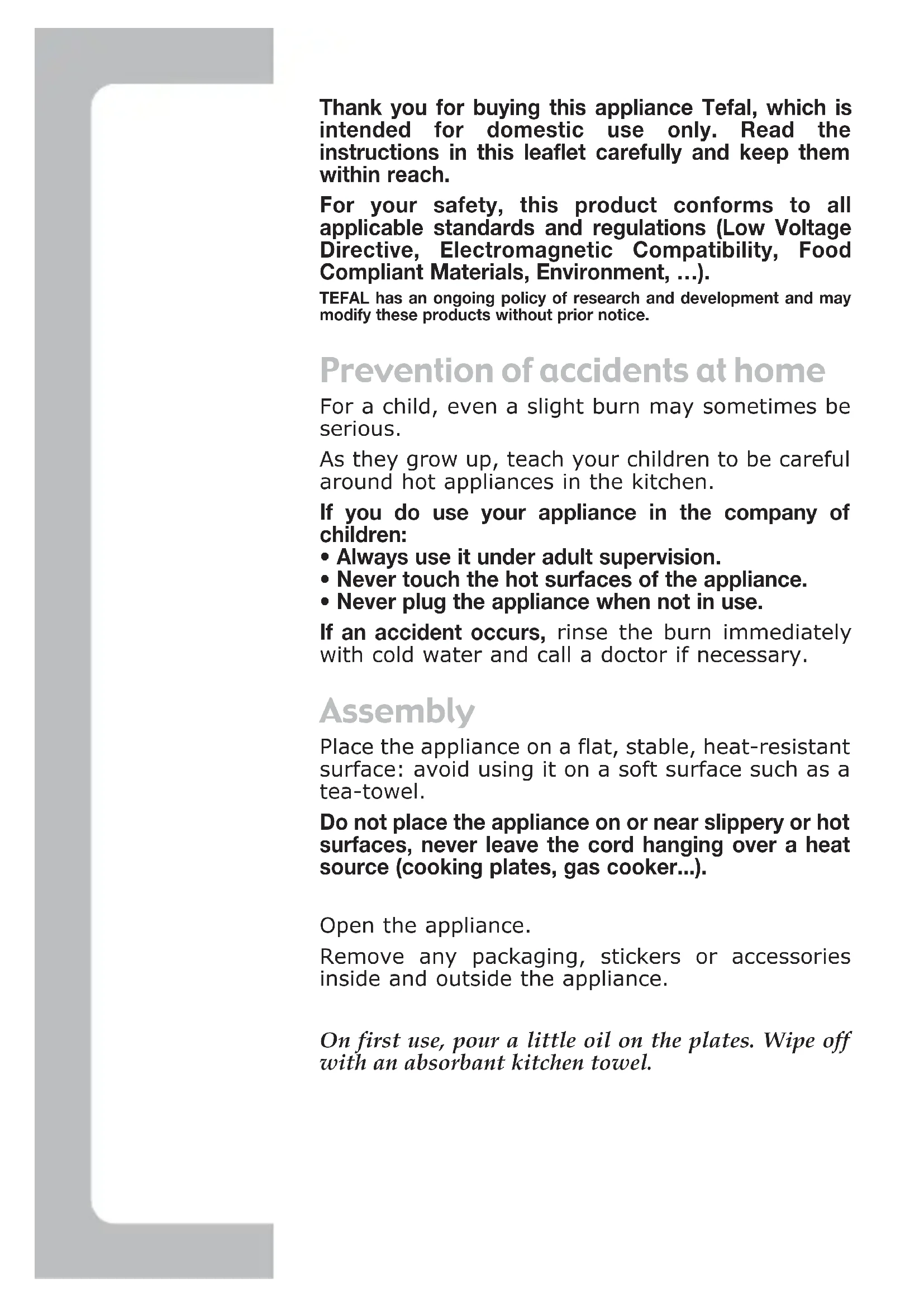 - Never plug the appliance when not in use. If an accident occurs, rinse the burn immediately with cold water and call a doctor if necessary. Assembly Place the appliance on a flat, stable, heat-resistant surface: avoid using it on a soft surface such as a tea-towel. Do not place the appliance on or near slippery or hot surfaces, never leave the cord hanging over a heat source (cooking plates, gas cooker...). Open the appliance. Remove any packaging, stickers or accessories inside and outside the appliance. On first use, pour a little oil on the plates. Wipe off with an absorbant kitchen towel. Gaufr ultracomp 08/05 12/10/05 16:57 Page 34Français Connection and pre-heating Close the appliance. Plug the cord in the wall socket: the red light comes on . During first use, the appliance may give off a slight odour and smoke. This is normal. Check that your electric supply is compatible with the power and the voltage indicated under the appliance. Connect the appliance to a wall socket with an earth connection. If the power supply cord is damaged, it must be replaced by the manufacturer or its service agent or a similarly qualified person in order to avoid a hazard. Cooking Allow the appliance to pre-heat, the green light comes on when the correct cooking temperature is reached . Do not touch the metallic surfaces of the appliance during pre-heating, because they are very hot. Select the desired temperature using the thermostat . Open the appliance. Pour the waffle batter into the centre of the hollow part of the plate . Immediately close the appliance, using the handle, so that the batter is evenly distributed over the whole surface of the plate . Do not hold onto the handle of the appliance during cooking, as this will prevent the batter from rising.
