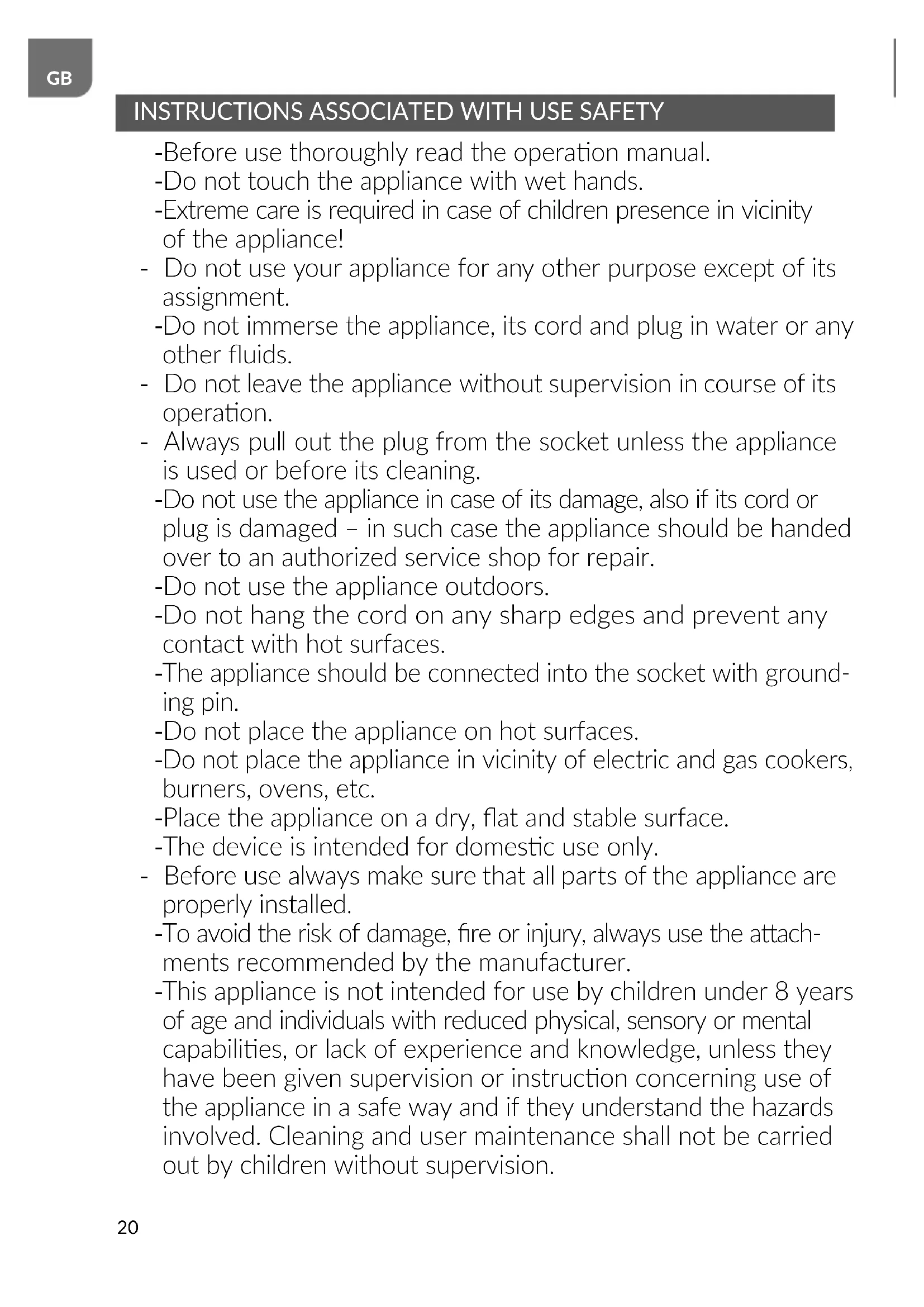 Do not use the appliance in case of its damage, also if its cord or plug is damaged – in such case the appliance should be handed over to an authorized service shop for repair. - Do not use the appliance outdoors.