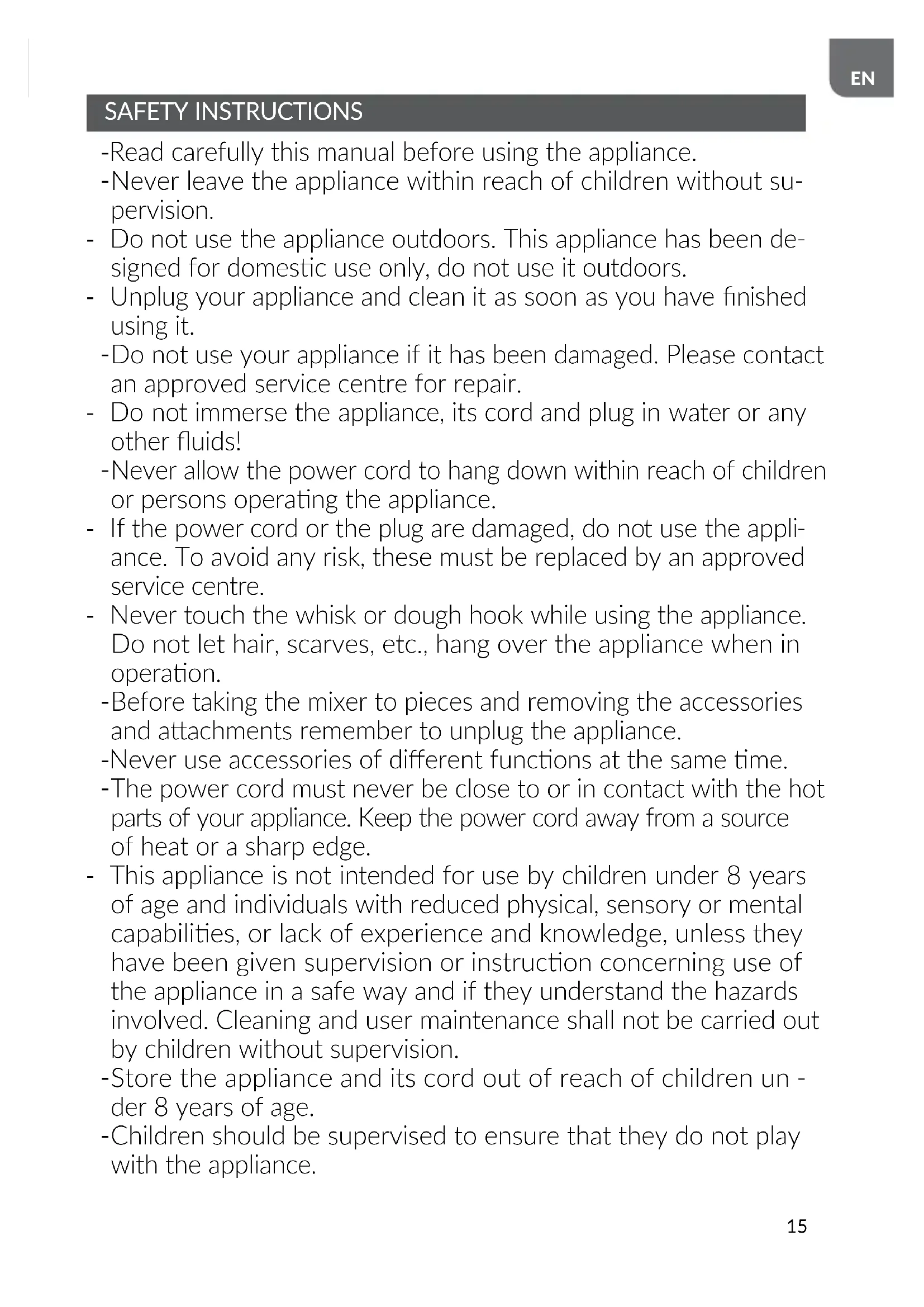 SAFETY INSTRUCTIONS - Read carefully this manual before using the appliance.