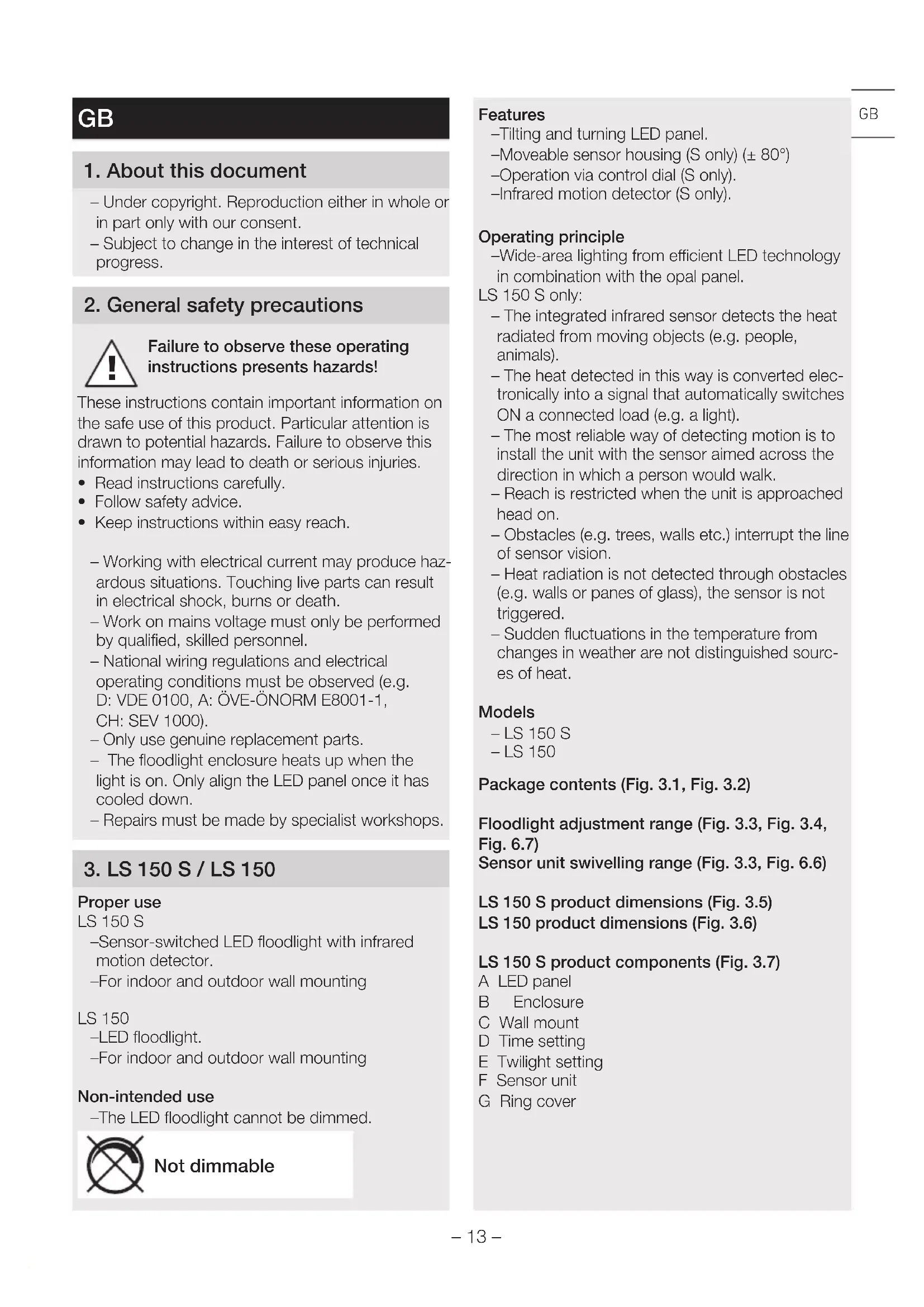 Proper use LS150S – Sensor-switched LED floodlight with infrared motion detector. – For indoor and outdoor wall mounting LS150 – LED floodlight. – For indoor and outdoor wall mounting Non-intended use – The LED floodlight cannot be dimmed. Not dimmable Features – Tilting and turning LED panel. – Moveable sensor housing (S only) (±80°) – Operation via control dial (S only). – Infrared motion detector (S only). Operating principle – Wide-area lighting from ecient LED technology in combination with the opal panel. LS 150 S only: – The integrated infrared sensor detects the heat radiated from moving objects (e.g. people, animals). – The heat detected in this way is converted elec- tronically into a signal that automatically switches ON a connected load (e.g. a light). – The most reliable way of detecting motion is to install the unit with the sensor aimed across the direction in which a person would walk. – Reach is restricted when the unit is approached head on. – Obstacles (e.g. trees, walls etc.) interrupt the line of sensor vision. – Heat radiation is not detected through obstacles (e.g. walls or panes of glass), the sensor is not triggered. – Sudden fluctuations in the temperature from changes in weather are not distinguished sourc- es of heat. Models – LS150S – LS150 Package contents (Fig.3.1, Fig.3.2) Floodlight adjustment range (Fig. 3.3, Fig.3.4, Fig.6.7) Sensor unit swivelling range (Fig. 3.3, Fig.6.6) LS150S product dimensions (Fig. 3.5) LS150product dimensions (Fig. 3.6) LS150S product components (Fig. 3.7) A LED panel B Enclosure C Wall mount D Time setting E Twilight setting F Sensor unit G Ring cover GB– 14 – LS150S product components (Fig. 3.8) A LED panel B Enclosure C Wall mount Technical specifications – Dimensions (H×W×D): LS 150 S: 210×155×176mm LS 150: 178×157×178mm – Power consumption (P
