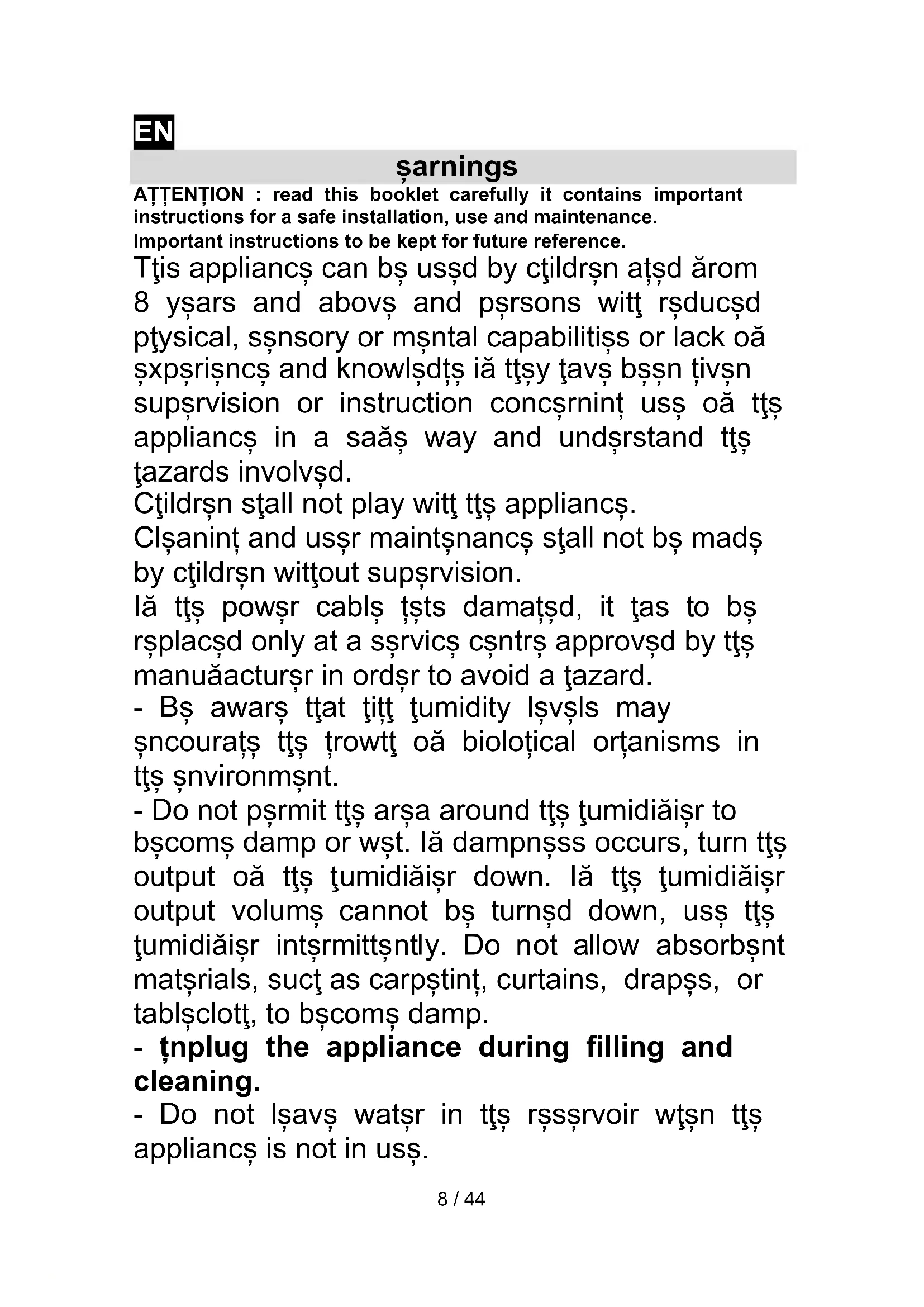 - WARNING: Micro-organisms ttat may bs prssnt in tts watsr or in tts svironmsnt wtsrs tts applancs is ussd or storsd, can trow in tts watsr rsssvoir and bs blown in tts air causint vrsry srsious tsaltt risks wtsn tts watsr is not rsnswsd and tts tank is not clsansd propsrly svry 3 days. - Empty tts tank and rsaill svry tird day. Bsəors rsaillint, clsan it witt arssst tap watsr. Rsmovs any scans, dposits, or ailm tta tas aormsd on tts sidss oä tts tank or on intsior suracss, and wips all suracss dry.