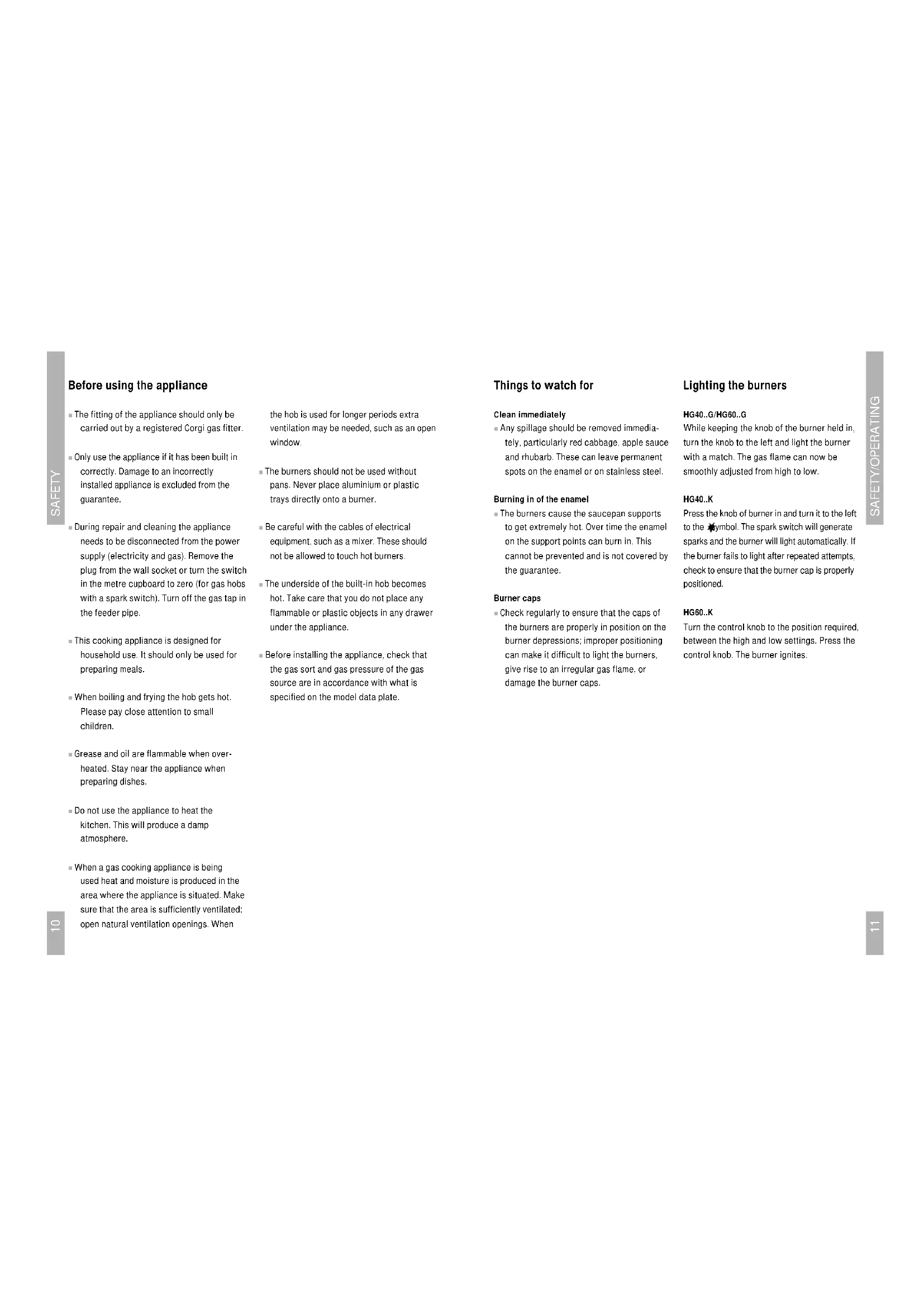 Things to watch for Clean immediately ■ Any spillage should be removed immedia- tely, particularly red cabbage, apple sauce and rhubarb. These can leave permanent spots on the enamel or on stainless steel. Burning in of the enamel ■ The burners cause the saucepan supports to get extremely hot. Over time the enamel on the support points can burn in. This cannot be prevented and is not covered by the guarantee. Burner caps ■ Check regularly to ensure that the caps of the burners are properly in position on the burner depressions; improper positioning can make it difficult to light the burners, give rise to an irregular gas flame, or damage the burner caps. Lighting the burners HG40..G/HG60..G While keeping the knob of the burner held in, turn the knob to the left and light the burner with a match. The gas flame can now be smoothly adjusted from high to low. HG40..K Press the knob of burner in and turn it to the left to the -symbol. The spark switch will generate sparks and the burner will light automatically. If the burner fails to light after repeated attempts, check to ensure that the burner cap is properly positioned. HG60..K Turn the control knob to the position required, between the high and low settings. Press the control knob. The burner ignites. SAFETY Before using the appliance ■ The fitting of the appliance should only be carried out by a registered Corgi gas fitter. ■ Only use the appliance if it has been built in correctly. Damage to an incorrectly installed appliance is excluded from the guarantee. ■ During repair and cleaning the appliance needs to be disconnected from the power supply (electricity and gas). Remove the plug from the wall socket or turn the switch in the metre cupboard to zero (for gas hobs with a spark switch). Turn off the gas tap in the feeder pipe. ■ This cooking appliance is designed for household use. It should only be used for preparing meals. ■ When boiling and frying the hob gets hot. Please pay close attention to small children. ■ Grease and oil are flammable when over- heated. Stay near the appliance when preparing dishes. ■ Do not use the appliance to heat the kitchen. This will produce a damp atmosphere. ■ When a gas cooking appliance is being used heat and moisture is produced in the area where the appliance is situated. Make sure that the area is sufficiently ventilated; open natural ventilation openings. When the hob is used for longer periods extra ventilation may be needed, such as an open window. ■ The burners should not be used without pans. Never place aluminium or plastic trays directly onto a burner. ■ Be careful with the cables of electrical equipment, such as a mixer. These should not be allowed to touch hot burners. ■ The underside of the built-in hob becomes hot. Take care that you do not place any flammable or plastic objects in any drawer under the appliance. ■ Before installing the appliance, check that the gas sort and gas pressure of the gas source are in accordance with what is specified on the model data plate. SAFETY/OPERATING13