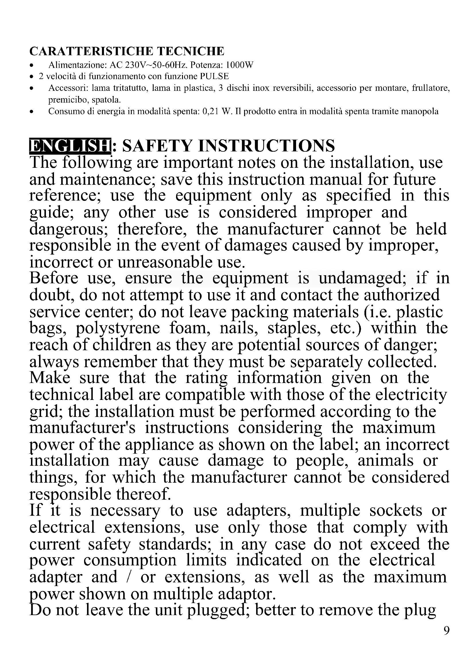 The following are important notes on the installation, use and maintenance; save this instruction manual for future reference; use the equipment only as specified in this guide; any other use is considered improper and dangerous; therefore, the manufacturer cannot be held responsible in the event of damages caused by improper, incorrect or unreasonable use. Before use, ensure the equipment is undamaged; if in doubt, do not attempt to use it and contact the authorized service center; do not leave packing materials (i.e. plastic bags, polystyrene foam, nails, staples, etc.) within the reach of children as they are potential sources of danger; always remember that they must be separately collected. Make sure that the rating information given on the technical label are compatible with those of the electricity grid; the installation must be performed according to the manufacturer's instructions considering the maximum power of the appliance as shown on the label; an incorrect installation may cause damage to people, animals or things, for which the manufacturer cannot be considered responsible thereof. If it is necessary to use adapters, multiple sockets or electrical extensions, use only those that comply with current safety standards; in any case do not exceed the power consumption limits indicated on the electrical adapter and / or extensions, as well as the maximum power shown on multiple adaptor. Do not leave the unit plugged; better to remove the plug10 from the mains when the device is not in use. Always disconnect from power supply if you leave it unattended. Cleaning operations should be carried out after unplugging the unit. If the unit is out of order and you do not want to fix it, it must be made inoperable by cutting power cord. - Do not allow the power cord to get closer to sharp objects or in contact with hot surfaces; do not pull it to disconnect the plug. - Do not use the appliance in the event of damage to the power cord, plug, or in case of short circuits; to repair the product only address an authorized service center. - Do not handle or touch the appliance with wet hands or bare feet. Do not expose the appliance to harmful weather conditions such as rain, moisture, frost, etc.. Always store it in a dry place. - This appliance cannot be used by children, even if they're more than 8 years old. - This appliance can be used by persons with reduced physical, sensory or mental capabilities or lack of experience and knowledge if they received supervision or instruction concerning use of appliance in a safe way and understand the hazards involved. - Children must not play with the appliance. - Keep the appliance and its cord out of reach of children less than 8 years. If the power cord is damaged, or in case of failure and / or malfunction do not tamper with the unit. The reparation must be done by manufacturer or by service center authorized by the manufacturer in order to prevent any risk. Failure to comply with the above may compromise the unit safety and invalidate the warranty. - This appliance is intended to be used in household and similar applications such as: staff kitchen areas in shops,11 offices and other working environments; by clients in hotels, motels and other residential type environments; farm houses, bed and breakfast type environments. - The appliance is not intended to be operated by means of an external timer or separate remote-control system. - Before every use, unroll the power cord. - Use original spare parts and accessories only. - Do not subject the product to strong impacts, serious damages may result. Don’t use near or under flammable materials (like curtains), heat, cold spots and steam. GENERAL INFORMATION At the first use, wash carefully all the parts that will be in touch with food such as containers, lids and blades.