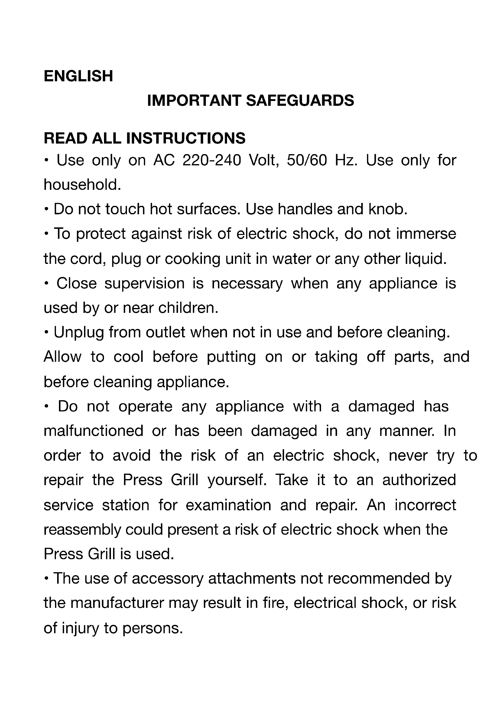 - Do not operate any appliance with a damaged has malfunctioned or has been damaged in any manner. In order to avoid the risk of an electric shock, never try to repair the Press Grill yourself. Take it to an authorized service station for examination and repair. An incorrect reassembly could present a risk of electric shock when the Press Grill is used.