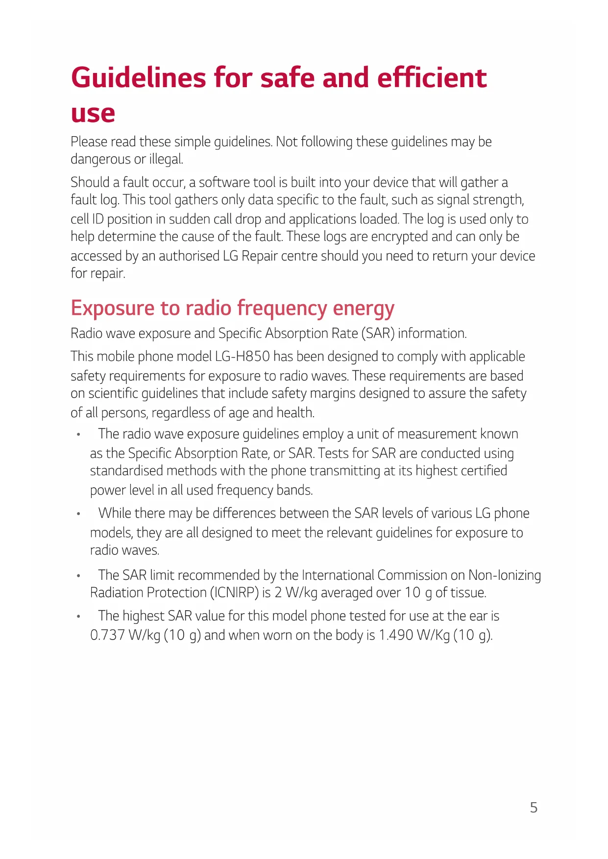 Appendix 129 LG Language Settings 129 LG Bridge 130 Phone software update 132 FAQ 135 Anti-Theft Guide 136 More information5 Guidelines for safe and efficient use Please read these simple guidelines. Not following these guidelines may be dangerous or illegal. Should a fault occur, a software tool is built into your device that will gather a fault log. This tool gathers only data specific to the fault, such as signal strength, cell ID position in sudden call drop and applications loaded. The log is used only to help determine the cause of the fault. These logs are encrypted and can only be accessed by an authorised LG Repair centre should you need to return your device for repair. Exposure to radio frequency energy Radio wave exposure and Specific Absorption Rate (SAR) information. This mobile phone model LG-H850 has been designed to comply with applicable safety requirements for exposure to radio waves. These requirements are based on scientific guidelines that include safety margins designed to assure the safety of all persons, regardless of age and health.