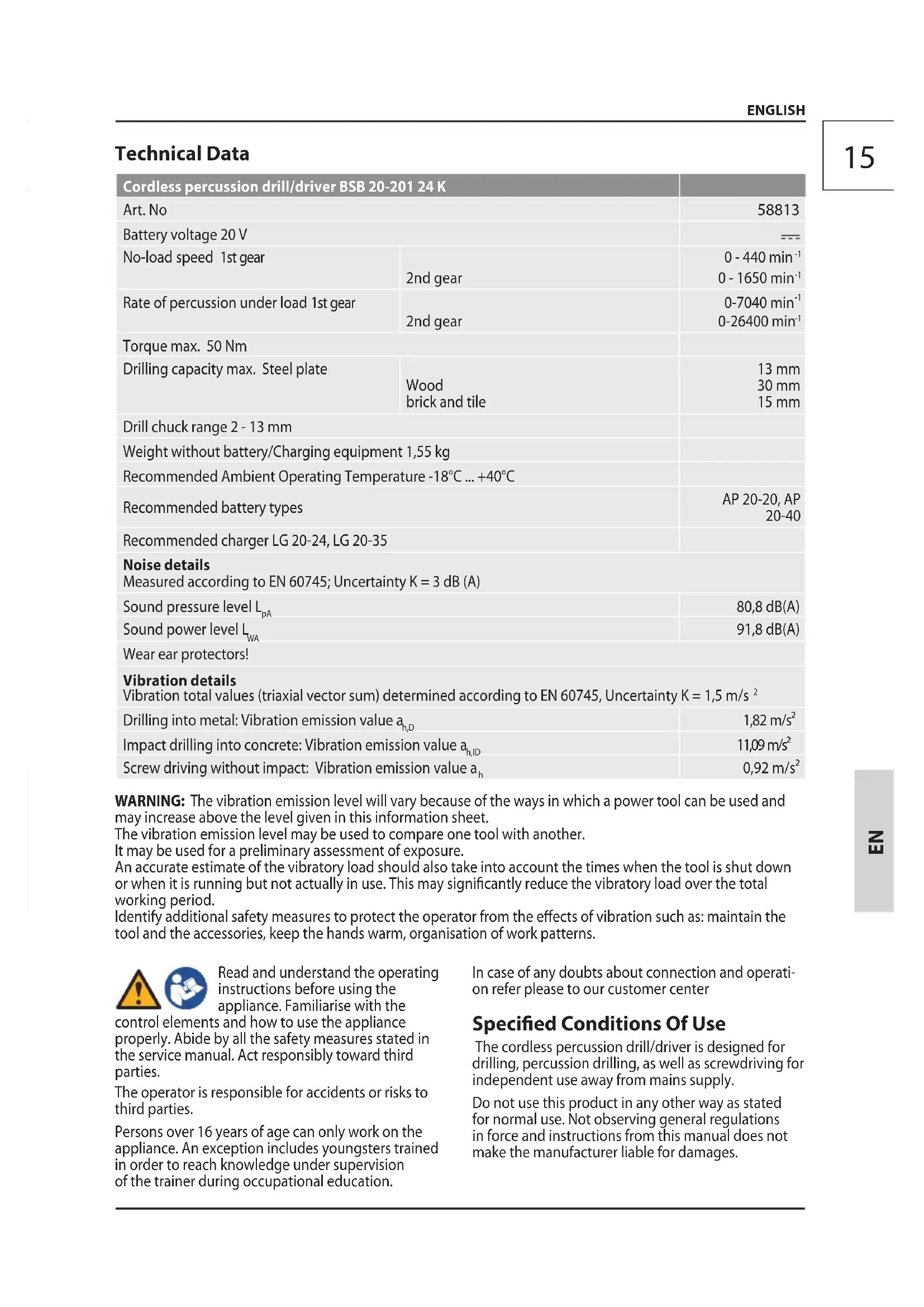 ENGLISH Technical Data Cordless percussion drill/driver BSB 20-201 24 K Art. No