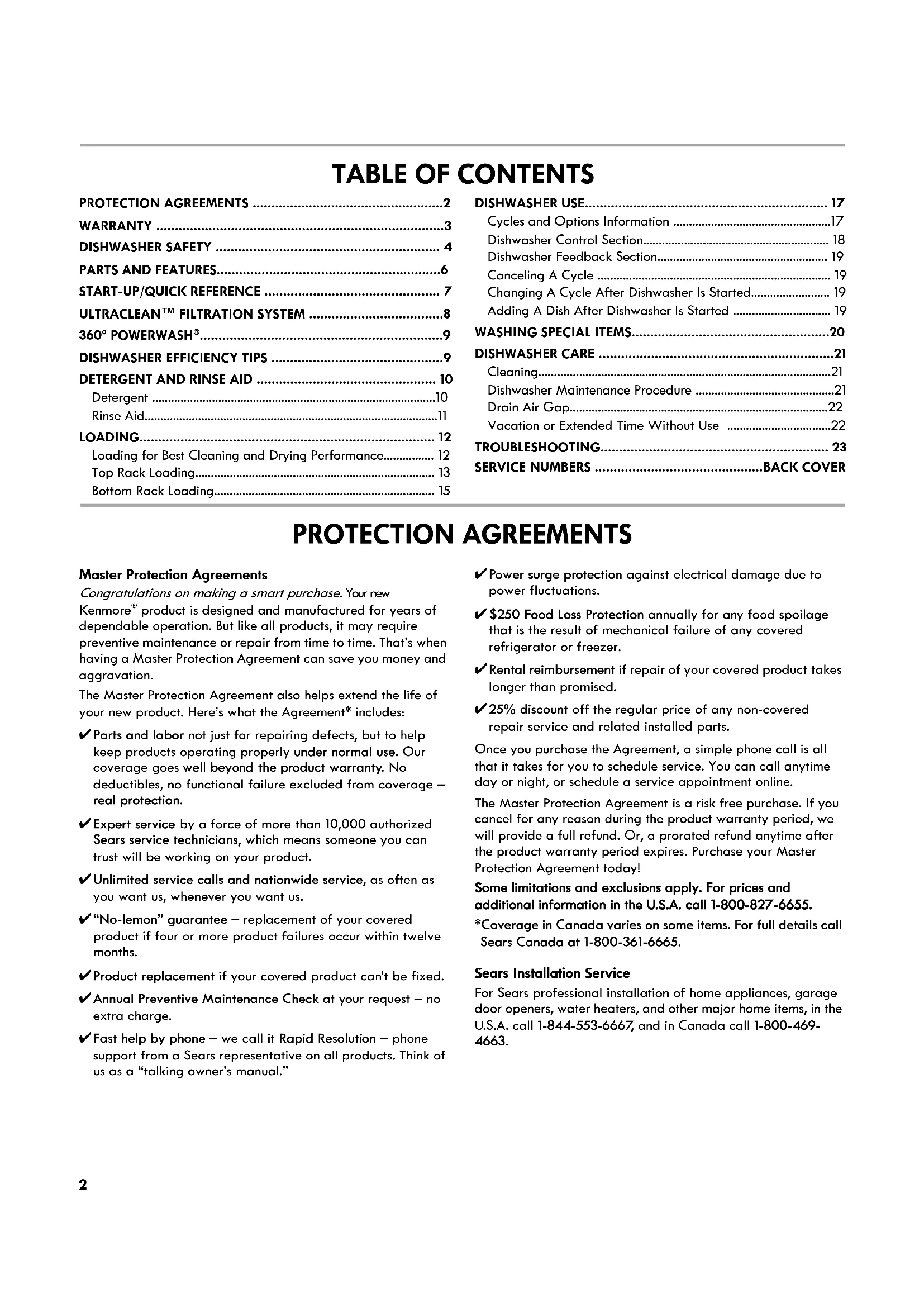 product is designed and manufactured for years of dependable operation. But like all products, it may require preventive maintenance or repair from time to time. That’s when having a Master Protection Agreement can save you money and aggravation. The Master Protection Agreement also helps extend the life of your new product. Here’s what the Agreement* includes: ✔Parts and labor not just for repairing defects, but to help keep products operating properly under normal use. Our coverage goes well beyond the product warranty. No deductibles, no functional failure excluded from coverage – real protection. ✔Expert service by a force of more than 10,000 authorized Sears service technicians, which means someone you can trust will be working on your product. ✔Unlimited service calls and nationwide service, as often as you want us, whenever you want us. ✔“No-lemon” guarantee – replacement of your covered product if four or more product failures occur within twelve months. ✔Product replacement if your covered product can’t be fixed. ✔Annual Preventive Maintenance Check at your request – no extra charge. ✔Fast help by phone – we call it Rapid Resolution – phone support from a Sears representative on all products. Think of us as a “talking owner’s manual.” ✔Power surge protection against electrical damage due to power fluctuations. ✔$250 Food Loss Protection annually for any food spoilage that is the result of mechanical failure of any covered refrigerator or freezer. ✔Rental reimbursement if repair of your covered product takes longer than promised. ✔25% discount off the regular price of any non-covered repair service and related installed parts. Once you purchase the Agreement, a simple phone call is all that it takes for you to schedule service. You can call anytime day or night, or schedule a service appointment online. The Master Protection Agreement is a risk free purchase. If you cancel for any reason during the product warranty period, we will provide a full refund. Or, a prorated refund anytime after the product warranty period expires. Purchase your Master Protection Agreement today! Some limitations and exclusions apply. For prices and additional information in the U.S.A. call 18008276655. *Coverage in Canada varies on some items. For full details call Sears Canada at 18003616665. Sears Installation Service For Sears professional installation of home appliances, garage door openers, water heaters, and other major home items, in the U.S.A. call 1-844-553-6667, and in Canada call 1-800-469-