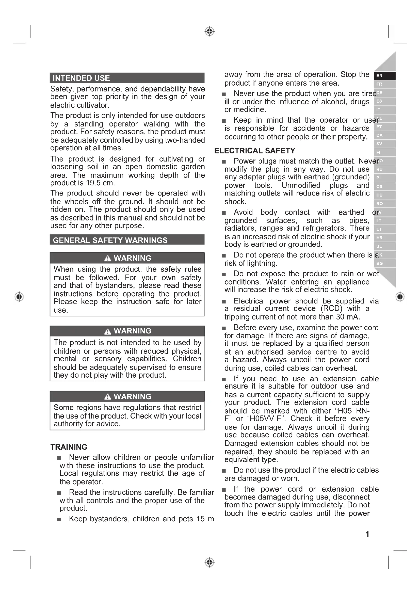 INTENDED USE Safety, performance, and dependability have been given top priority in the design of your electric cultivator. The product is only intended for use outdoors by a standing operator walking with the product. For safety reasons, the product must be adequately controlled by using two-handed operation at all times. The product is designed for cultivating or loosening soil in an open domestic garden area. The maximum working depth of the product is 19.5 cm. The product should never be operated with the wheels off the ground. It should not be ridden on. The product should only be used as described in this manual and should not be used for any other purpose.
