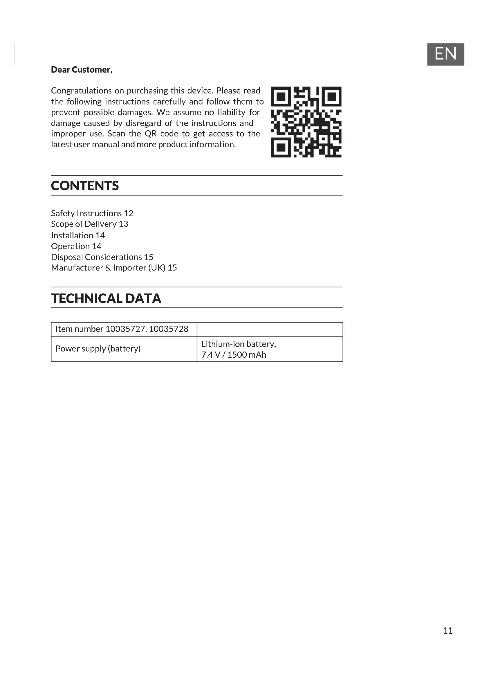 Dear Customer, Congratulations on purchasing this device. Please read the following instructions carefully and follow them to prevent possible damages. We assume no liability for damage caused by disregard of the instructions and improper use. Scan the QR code to get access to the latest user manual and more product information. CONTENTS Safety Instructions 12 Scope of Delivery 13 Installation 14 Operation 14 Disposal Considerations 15 Manufacturer & Importer (UK) 15 TECHNICAL DATA Item number 10035727, 10035728 Power supply (battery) Lithium-ion battery,