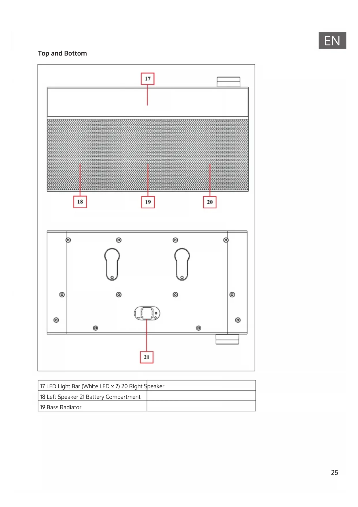Top and Bottom 17 LED Light Bar (White LED x 7) 20 Right Speaker 18 Left Speaker 21 Battery Compartment 19 Bass Radiator26
