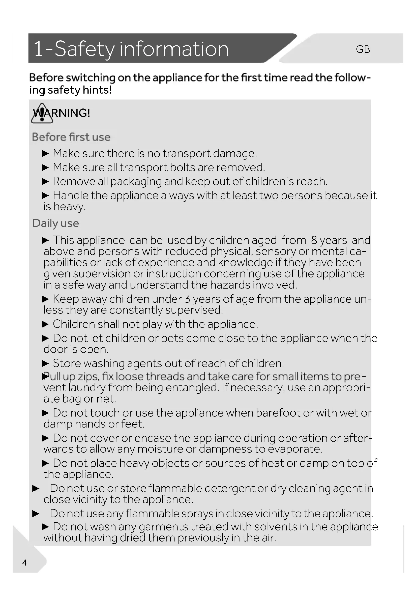 ing safety hints! WARNING! ▶ Make sure there is no transport damage. ▶ Make sure all transport bolts are removed. ▶ Remove all packaging and keep out of children´s reach. ▶ Handle the appliance always with at least two persons because it is heavy. Daily use ▶ This appliance can be used by children aged from 8 years and above and persons with reduced physical, sensory or mental ca- pabilities or lack of experience and knowledge if they have been given supervision or instruction concerning use of the appliance in a safe way and understand the hazards involved. ▶ Keep away children under 3 years of age from the appliance un- less they are constantly supervised. ▶ Children shall not play with the appliance. ▶ Do not let children or pets come close to the appliance when the door is open. ▶ Store washing agents out of reach of children.