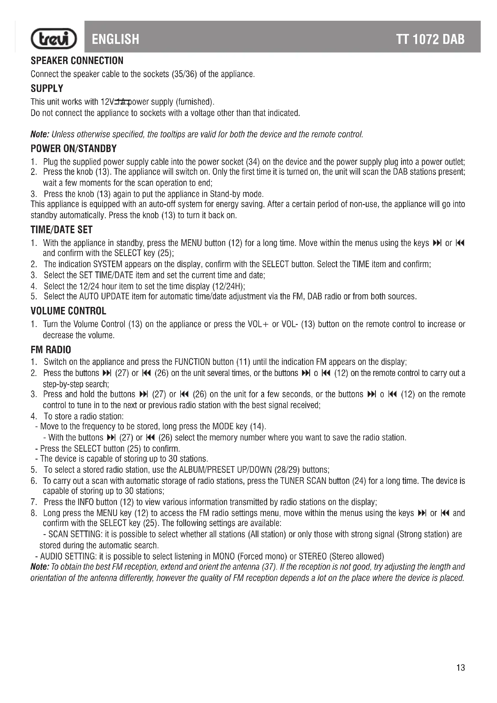 TT 1072 DAB ENGLISH SPEAKER CONNECTION Connect the speaker cable to the sockets (35/36) of the appliance. SUPPLY This unit works with 12V 1A power supply (furnished). Do not connect the appliance to sockets with a voltage other than that indicated. Note: Unless otherwise specified, the tooltips are valid for both the device and the remote control.