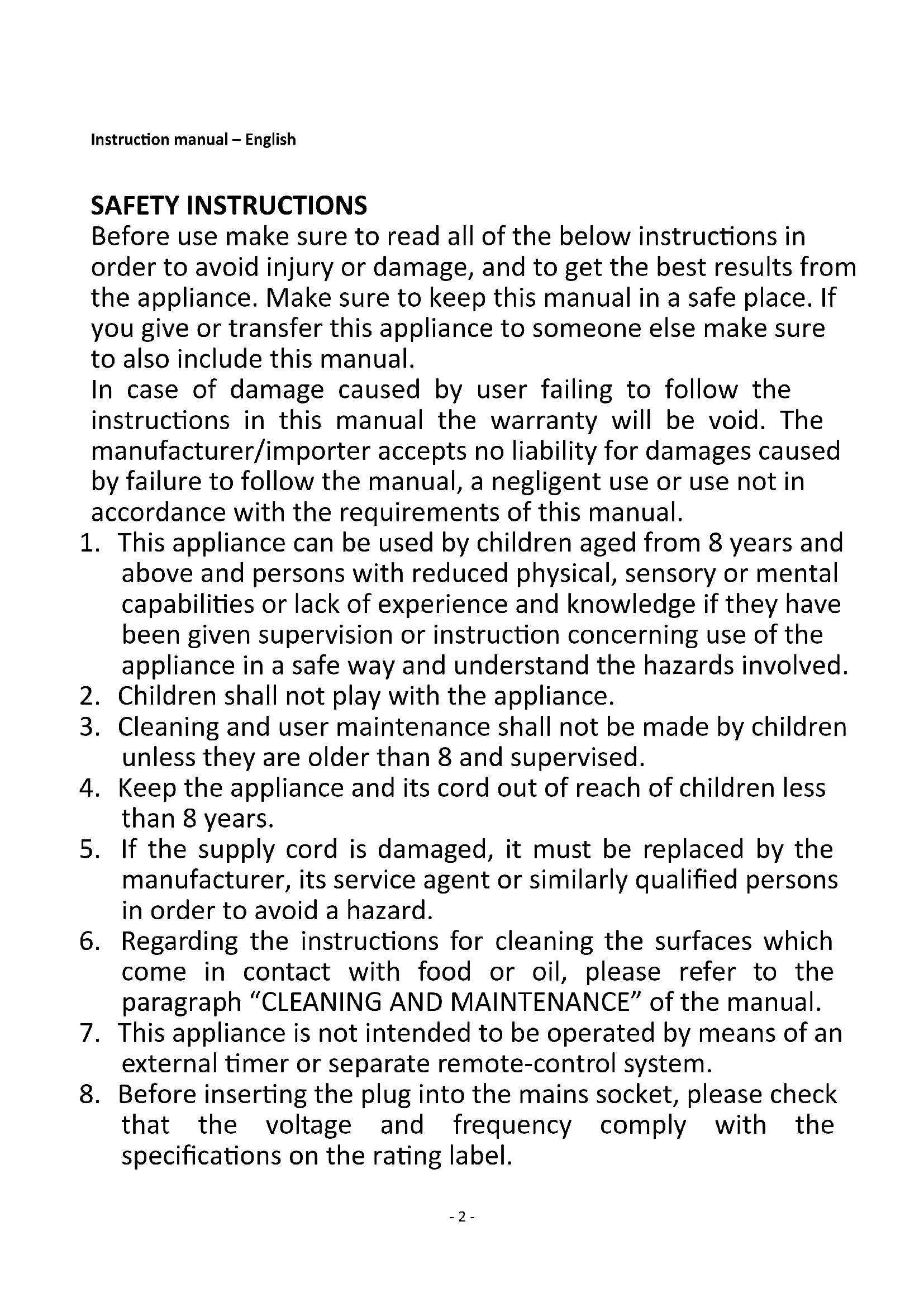 CG-124243.1 Multi Grill (EN) Multi-Grill (DE) Multigrill (FR) Griglia multifunzionale (IT)- 1 - Content – Inhalt – Teneur – Contenuto Instruction manual – English .......................................................................................... - 2 - Bedienungsanleitung – Deutsch ..................................................................................... - 9 - Mode d’emploi – Français ............................................................................................ - 16 - Manuale d'istruzioni – Italiano ..................................................................................... - 23 -- 2 - Instruction manual – English SAFETY INSTRUCTIONS Before use make sure to read all of the below instructions in order to avoid injury or damage, and to get the best results from the appliance. Make sure to keep this manual in a safe place. If you give or transfer this appliance to someone else make sure to also include this manual. In case of damage caused by user failing to follow the instructions in this manual the warranty will be void. The manufacturer/importer accepts no liability for damages caused by failure to follow the manual, a negligent use or use not in accordance with the requirements of this manual.