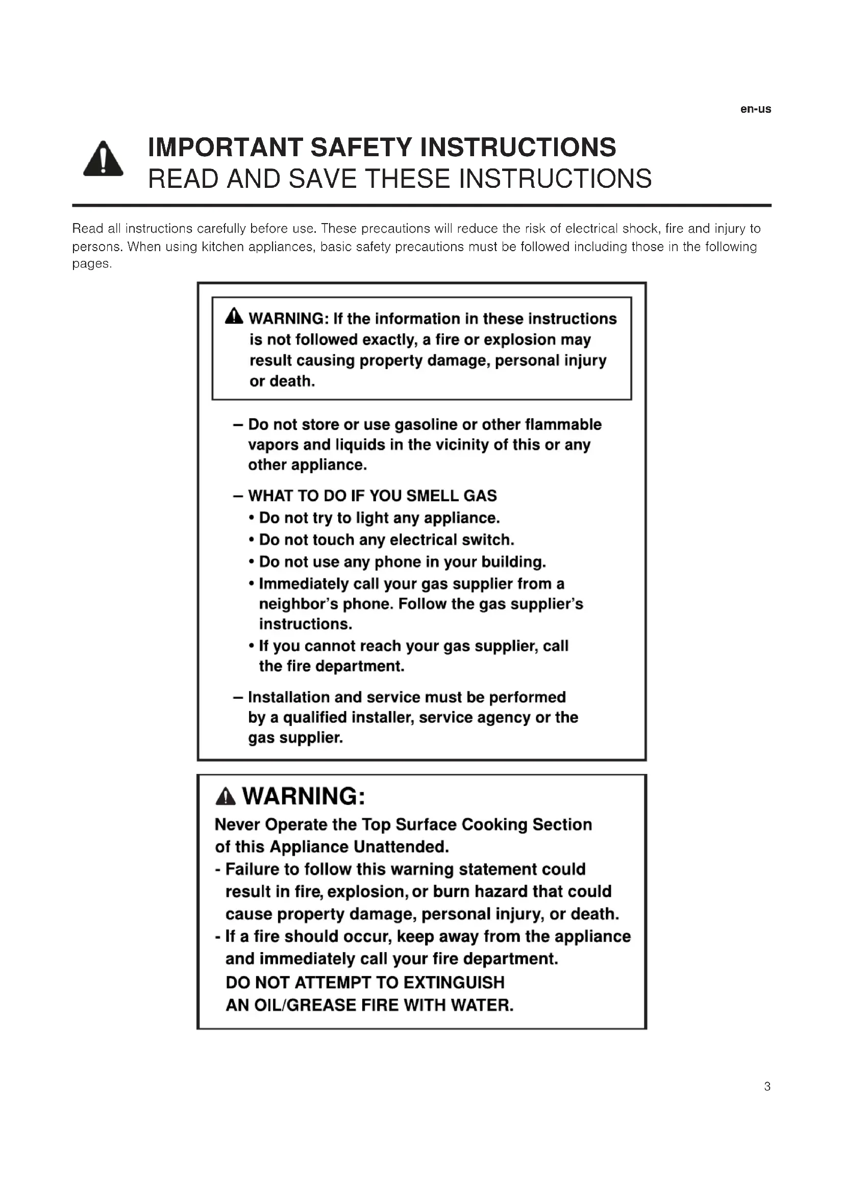 1.1 Safety definitions Here you can find explanations of the safety signal words used in this manual. WARNING This indicates that death or serious injuries may occur as a result of non-observance of this warning. CAUTION This indicates that minor or moderate injuries may occur as a result of non-observance of this warning. NOTICE: This indicates that damage to the appliance or property may occur as a result of non-compliance with this advi- sory. Note:This alerts you to important information and/or tips. 1.2 General information ¡ Read this manual carefully. ¡ Keep the manual and the product information in a safe place for future reference or for the next owner. ¡ Do not connect the appliance if it has been damaged in transit. 1.3 Intended use The appliance can only be used safely if it is correctly in- stalled according to the installation instructions. The in- staller is responsible for ensuring that the appliance works perfectly at its installation location. Only use this appliance: ¡ for cooking purposes. ¡ Under supervision. Never leave the appliance unat- tended when cooking for short periods. ¡ In private households and in a residential environment. Do not use the appliance: ¡ On boats or in vehicles. ¡ as a room heater. ¡ This appliance is not intended for operation with an ex- ternal time switch or external remote control. Call Customer Service if you want to convert your appli- ance to a different type of gas. 1.4 Restriction on user group This appliance is not intended for use by persons (includ- ing children) with reduced physical, sensory or mental ca- pabilities, or lack of experience and knowledge, unless they have been given supervision or instruction concern- ing use of the appliance by a person responsible for their safety. When children become old enough to use the appliance, it is the responsibility of the parents or legal guardians to ensure that they are instructed in safe practices by quali- fied persons. Children should be supervised to ensure that they do not play with the appliance. Do not let children play with the appliance. 1.5 Safe use WARNING When properly cared for, your new appliance has been designed to be safe and reliable. ▶ Read all instructions carefully before use. These pre- cautions will reduce the risk of burns, electric shock, fire, and injury to persons. ▶ When using kitchen appliances, basic safety precau- tions must be followed, including those in the following pages. WARNING Overheated materials can cause fire or burns. ▶ Do not allow aluminum foil, plastic, paper or cloth to come in contact with a hot surface element, burner or grate. ▶ Do not allow pans to boil dry. Set the burner control so that the flame does not extend beyond the bottom of the pan. Take care that drafts like those from fans or forced air vents do not push the flames so that they extend beyond the edges of the pan. During a power failure, only the cooktop burners can be lit manually. Unattended cooking on a cooktop with fat or oil can be dangerous and may result in a fire. ▶ Do not leave the cooktop unattended when in use. A fire could occur during cooking. ▶ Always have a working smoke detector near the kitchen.