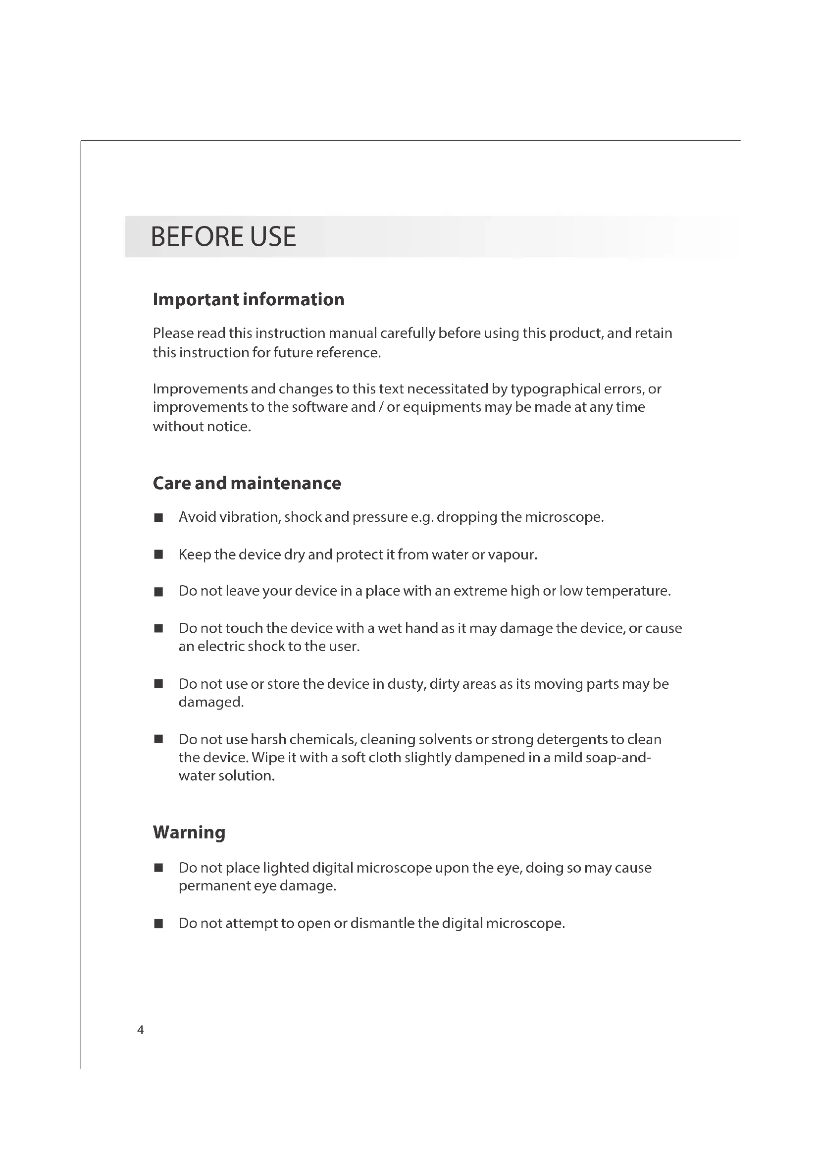 System settings menu 19Image rotation / ip Timed shot setup Movie setup Save setting Language setting Advanced settings Uninstalling the xploview software Device setup Full screen viewing 18 3BEFORE USE Important information Please read this instruction manual carefully before using this product, and retain this instruction for future reference. Improvements and changes to this text necessitated by typographical errors, or improvements to the software and / or equipments may be made at any time without notice. Care and maintenance Avoid vibration, shock and pressure e.g. dropping the microscope. Keep the device dry and protect it from water or vapour. Do not leave your device in a place with an extreme high or low temperature. Do not touch the device with a wet hand as it may damage the device, or cause an electric shock to the user. Do not use or store the device in dusty, dirty areas as its moving parts may be damaged. Do not use harsh chemicals, cleaning solvents or strong detergents to clean the device. Wipe it with a soft cloth slightly dampened in a mild soap-and- water solution. Warning Do not place lighted digital microscope upon the eye, doing so may cause permanent eye damage. Do not attempt to open or dismantle the digital microscope. 4Product description This digital microscope diers from a traditional optical microscope, where, instead of looking through an eyepiece, magnied image or live video is displayed on a computer monitor via USB connection. This device has 2 magnication powers, it can magnify images up to 60x and 250x when placed directly on top of the object and through a 17” monitor. Magnication power depends on the size of the monitor used - the larger the monitor, the higher the magnication. This device has 4 LED lights, where the intensity can be adjusted. Computer requirements Windows based PC Windows 10 (32 bit or 64 bit) Windows 8 (32 bit or 64 bit) Windows 7 (32 bit or 64 bit) Windows Vista (32 bit or 64 bit) Windows XP SP2, SP3 Compatible operating systems USB USB 2.0