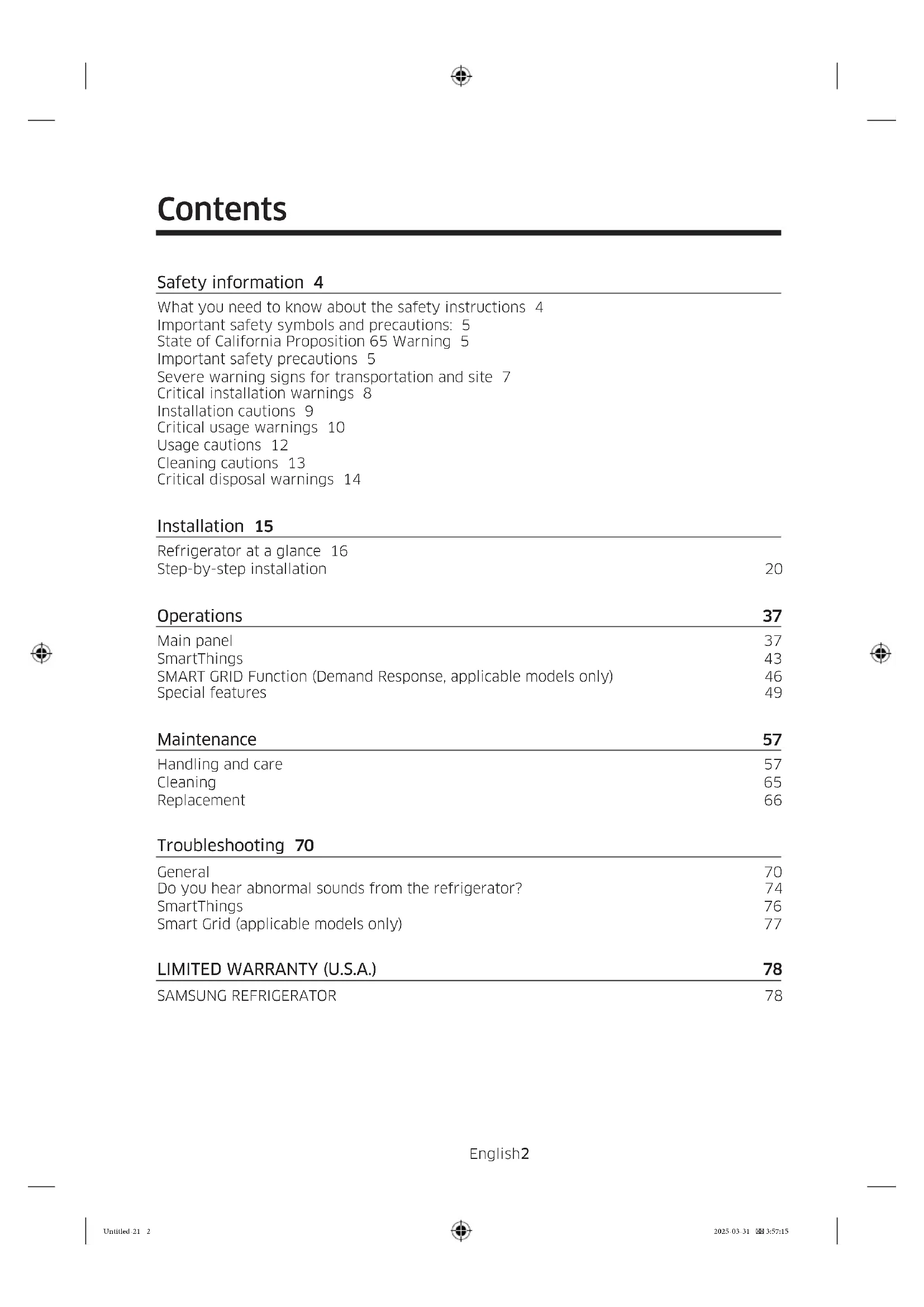 Refrigerator User manual Free Standing Appliance Untitled-21 1Untitled-21 1 2025-03-31 3:57:152025-03-31 3:57:15English2 Contents Safety information 4 What you need to know about the safety instructions 4 Important safety symbols and precautions: 5 State of California Proposition 65 Warning 5 Important safety precautions 5 Severe warning signs for transportation and site 7 Critical installation warnings 8 Installation cautions 9 Critical usage warnings 10 Usage cautions 12 Cleaning cautions 13 Critical disposal warnings 14 Installation 15 Refrigerator at a glance 16 Step-by-step installation 20 Operations 37 Main panel 37 SmartThings 43 SMART GRID Function (Demand Response, applicable models only) 46 Special features 49 Maintenance 57 Handling and care 57 Cleaning 65 Replacement 66 Troubleshooting 70 General 70 Do you hear abnormal sounds from the refrigerator? 74 SmartThings 76 Smart Grid (applicable models only) 77