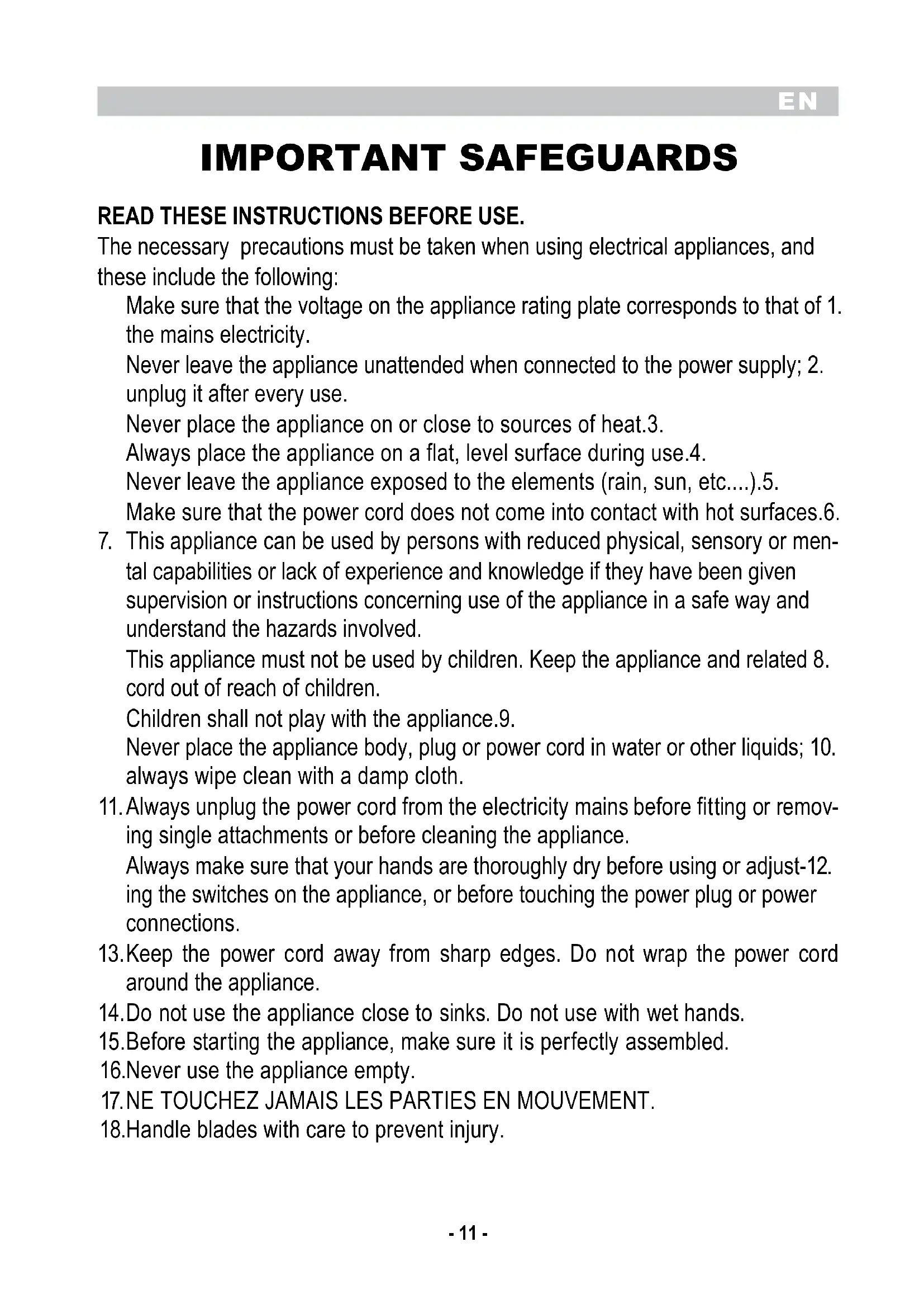 IMPORTANT SAFEGUARDS READ THESE INSTRUCTIONS BEFORE USE. The necessary precautions must be taken when using electrical appliances, and these include the following: Make sure that the voltage on the appliance rating plate corresponds to that of 1. the mains electricity. Never leave the appliance unattended when connected to the power supply; 2. unplug it after every use. Never place the appliance on or close to sources of heat.3. Always place the appliance on a flat, level surface during use.4. Never leave the appliance exposed to the elements (rain, sun, etc....).5. Make sure that the power cord does not come into contact with hot surfaces.6. This appliance can be used by persons with reduced physical, sensory or men-7. tal capabilities or lack of experience and knowledge if they have been given supervision or instructions concerning use of the appliance in a safe way and understand the hazards involved. This appliance must not be used by children. Keep the appliance and related 8. cord out of reach of children. Children shall not play with the appliance.9. Never place the appliance body, plug or power cord in water or other liquids; 10. always wipe clean with a damp cloth. Always unplug the power cord from the electricity mains before fitting or remov-11. ing single attachments or before cleaning the appliance. Always make sure that your hands are thoroughly dry before using or adjust-12. ing the switches on the appliance, or before touching the power plug or power connections. Keep the power cord away from sharp edges. Do not wrap the power cord 13. around the appliance. Do not use the appliance close to sinks. Do not use with wet hands.14. Before starting the appliance, make sure it is perfectly assembled.15. Never use the appliance empty.16. NE TOUCHEZ JAMAIS LES PARTIES EN MOUVEMENT.17. Handle blades with care to prevent injury.18.EN
