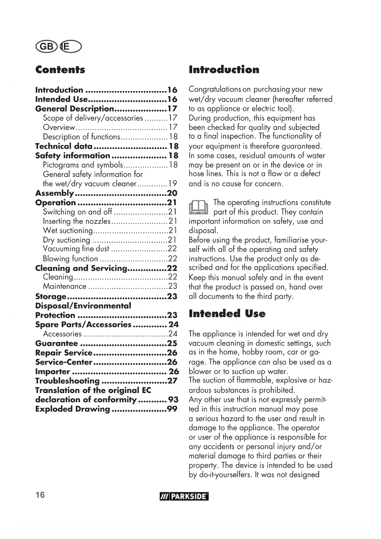 - Exploded Drawing Introduction Congratulations on purchasing your new wet/dry vacuum cleaner (hereafter referred to as appliance or electric tool). During production, this equipment has been checked for quality and subjected to a nal inspection. The functionality of your equipment is therefore guaranteed. In some cases, residual amounts of water may be present on or in the device or in hose lines. This is not a aw or a defect and is no cause for concern. The operating instructions constitute part of this product. They contain important information on safety, use and disposal. Before using the product, familiarise your- self with all of the operating and safety instructions. Use the product only as de- scribed and for the applications specied. Keep this manual safely and in the event that the product is passed on, hand over all documents to the third party. Intended Use The appliance is intended for wet and dry vacuum cleaning in domestic settings, such asin the home, hobby room, car or ga- rage. The appliance can also be used as a blower or to suction up water. The suction of ammable, explosive or haz- ardous substances is prohibited. Any other use that is not expressly permit- ted in this instruction manual may pose a serious hazard to the user and result in damage to the appliance. The operator or user of the appliance is responsible for any accidents or personal injury and/or material damage to third parties or their property. The device is intended to be used by do-it-yourselfers. It was not designedGB IE p. 99