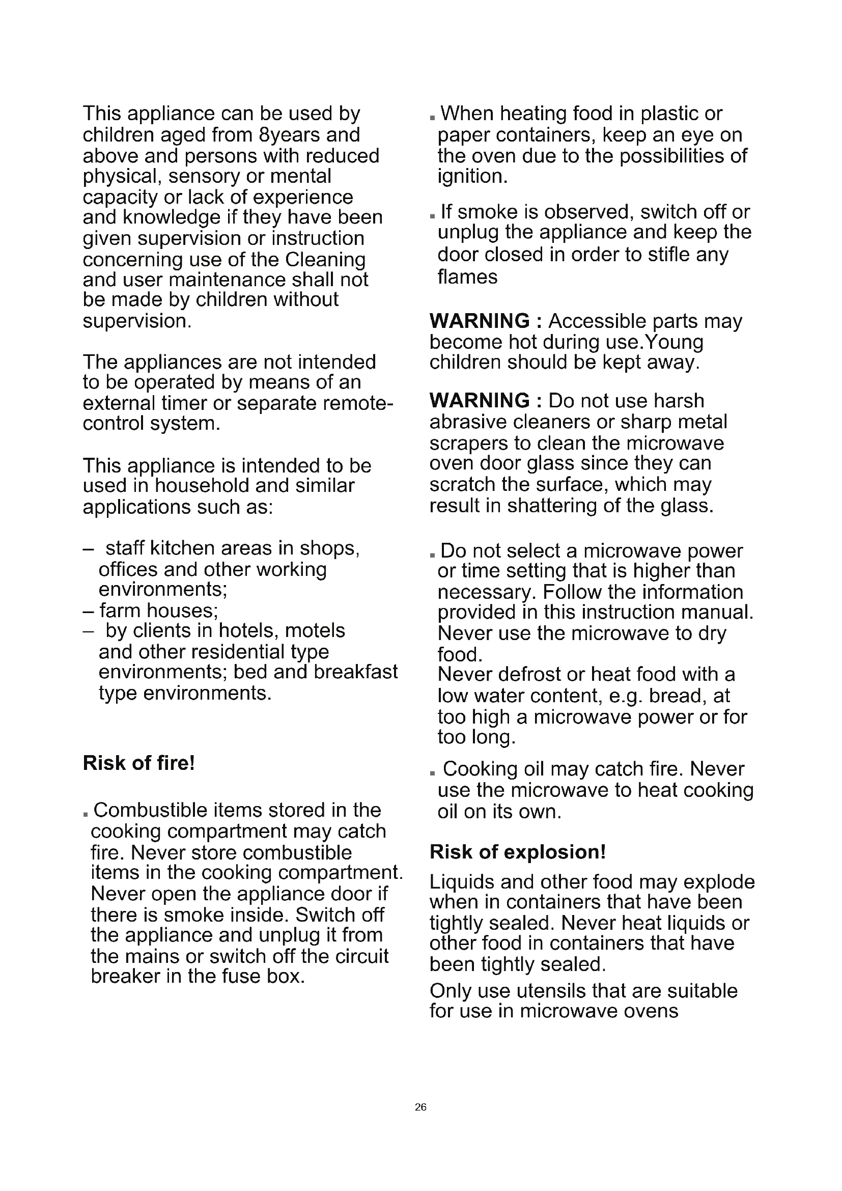 appliance is switched off before replacing the lamp to avoid the possibility of electric shock. Risk of burns! ■ During use the appliance becomes hot. Care should be taken to avoid touching heating elements inside the oven. ■ Accessories and ovenware become very hot. Always use oven gloves to remove accessories or ovenware from the cooking compartment.28 ■ Alcoholic vapours may catch re in the hot cooking compartment. Never prepare food containing large quantities of drinks with a high alcohol content. Only use small quantities of drinks with a high alcohol content. Open the appliance door with care. ■ Foods with peel or skin may burst or explode during, or even after, heating. Never cook eggs in their shells or reheat hard-boiled eggs. Never cook shellsh or crustaceans. Always prick the yoke when baking or poaching eggs. The skin of foods that have a peel or skin, such as apples, tomatoes, potatoes and sausages, may burst. Before heating, prick the peel or skin. ■ The contents of feeding bottles and baby food jars shall be stirred or shaken and the temperature checked before consumption, in oder to avoid burns. ■ Heated food gives off heat. The ovenware may become hot. Always use oven gloves to remove ovenware or accessories from the cooking compartment.