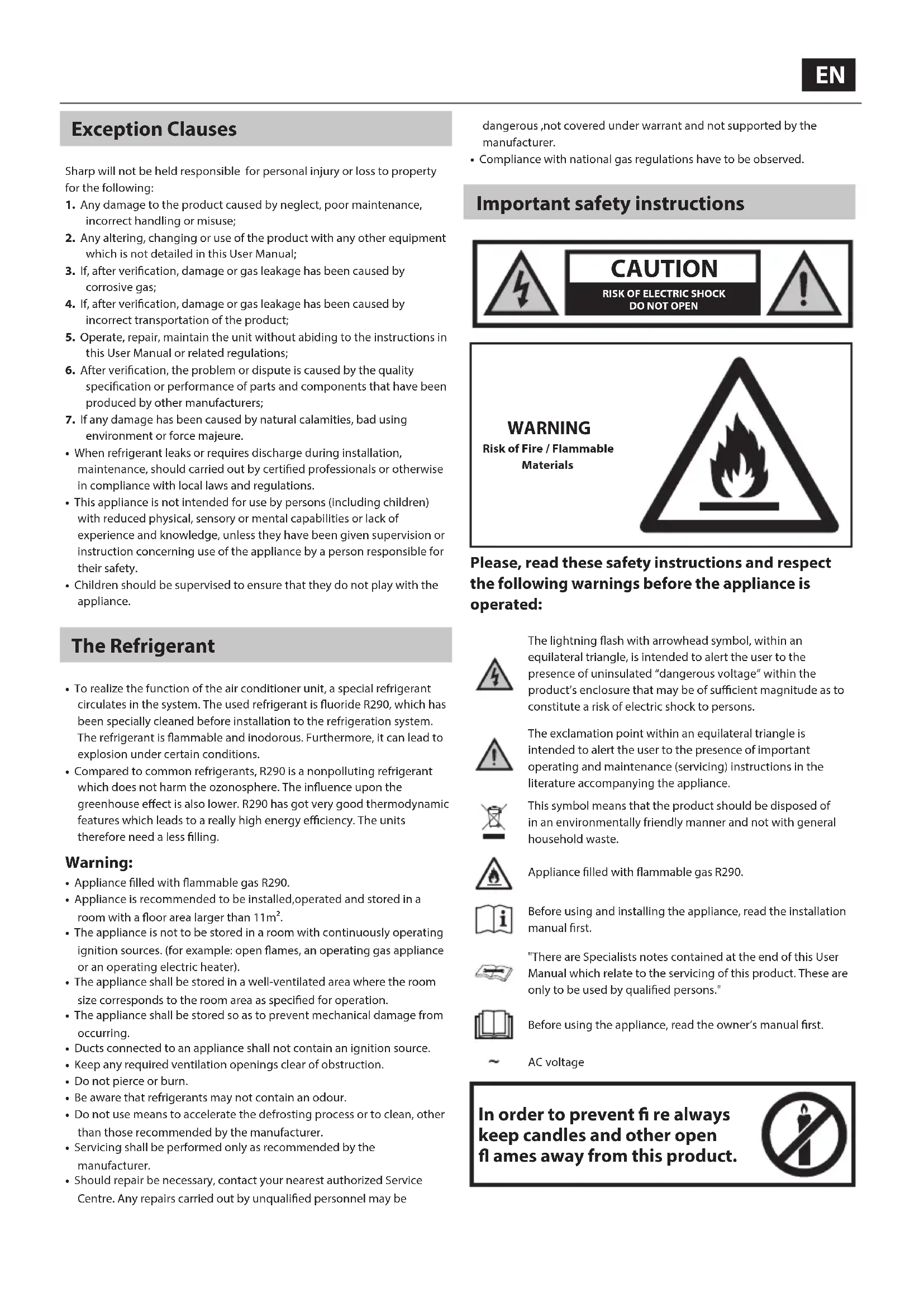WARNING Risk of Fire / Flammable Materials Please, read these safety instructions and respect the following warnings before the appliance is operated: The lightning ash with arrowhead symbol, within an equilateral triangle, is intended to alert the user to the presence of uninsulated “dangerous voltage” within the product’s enclosure that may be of sucient magnitude as to constitute a risk of electric shock to persons.The exclamation point within an equilateral triangle is intended to alert the user to the presence of important operating and maintenance (servicing) instructions in the literature accompanying the appliance.This symbol means that the product should be disposed of in an environmentally friendly manner and not with general household waste.Appliance lled with ammable gas R290.Before using and installing the appliance, read the installation manual rst."There are Specialists notes contained at the end of this User Manual which relate to the servicing of this product. These are only to be used by qualied persons."Before using the appliance, read the owner’s manual rst.AC voltage In order to prevent re always keep candles and other open ames away from this product.