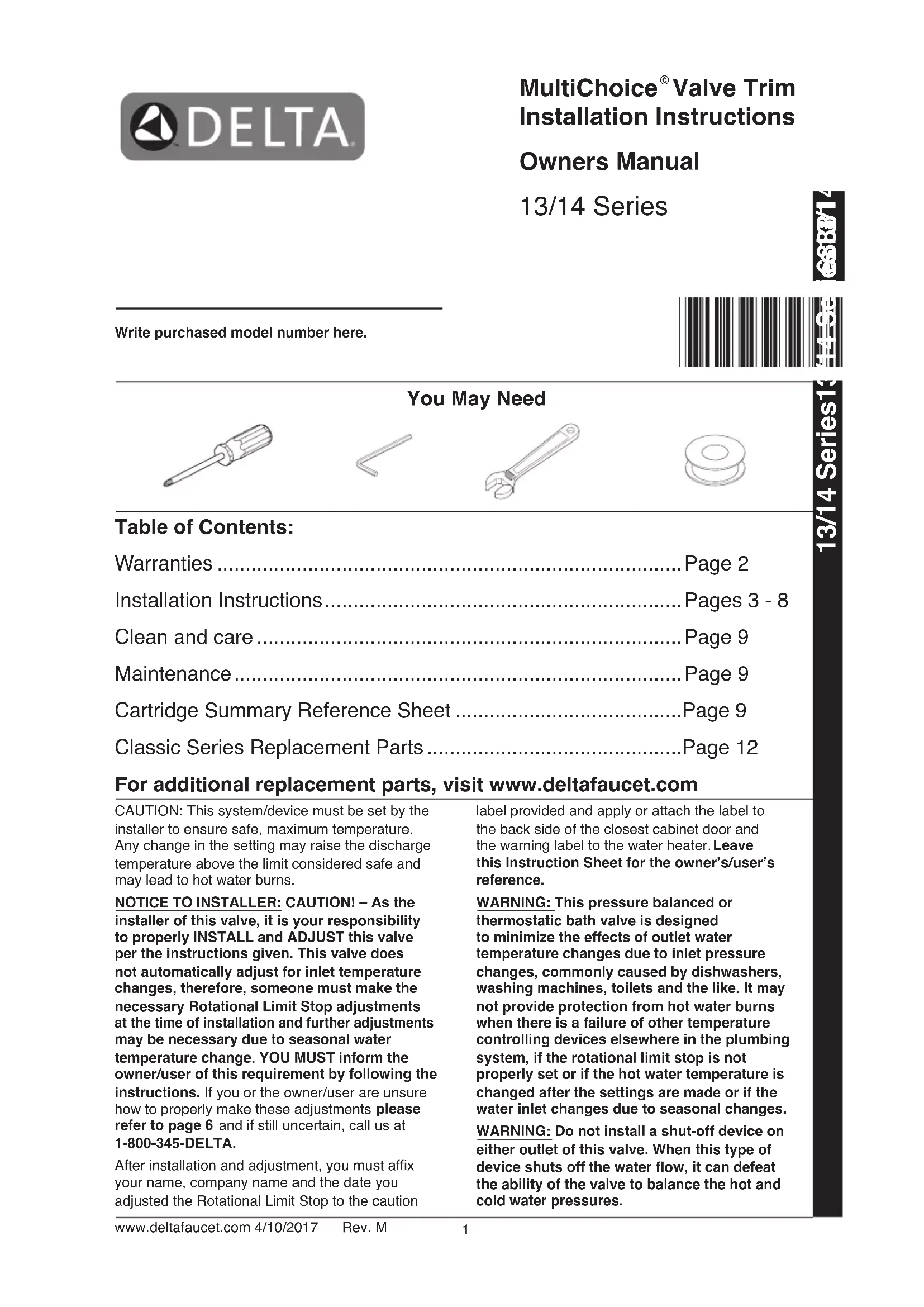 NOTICE TO INSTALLER: CAUTION! - As the installer of this valve, it is your responsibility to properly INSTALL and ADJUST this valve per the instructions given. This valve does not automatically adjust for inlet temperature changes, therefore, someone must make the necessary Rotational Limit Stop adjustments at the time of installation and further adjustments may be necessary due to seasonal water temperature change. YOU MUST inform the owner/user of this requirement by following the instructions. If you or the owner/user are unsure how to properly make these adjustments please refer to page 6 and if still uncertain, call us at 1-800-345-DELTA.