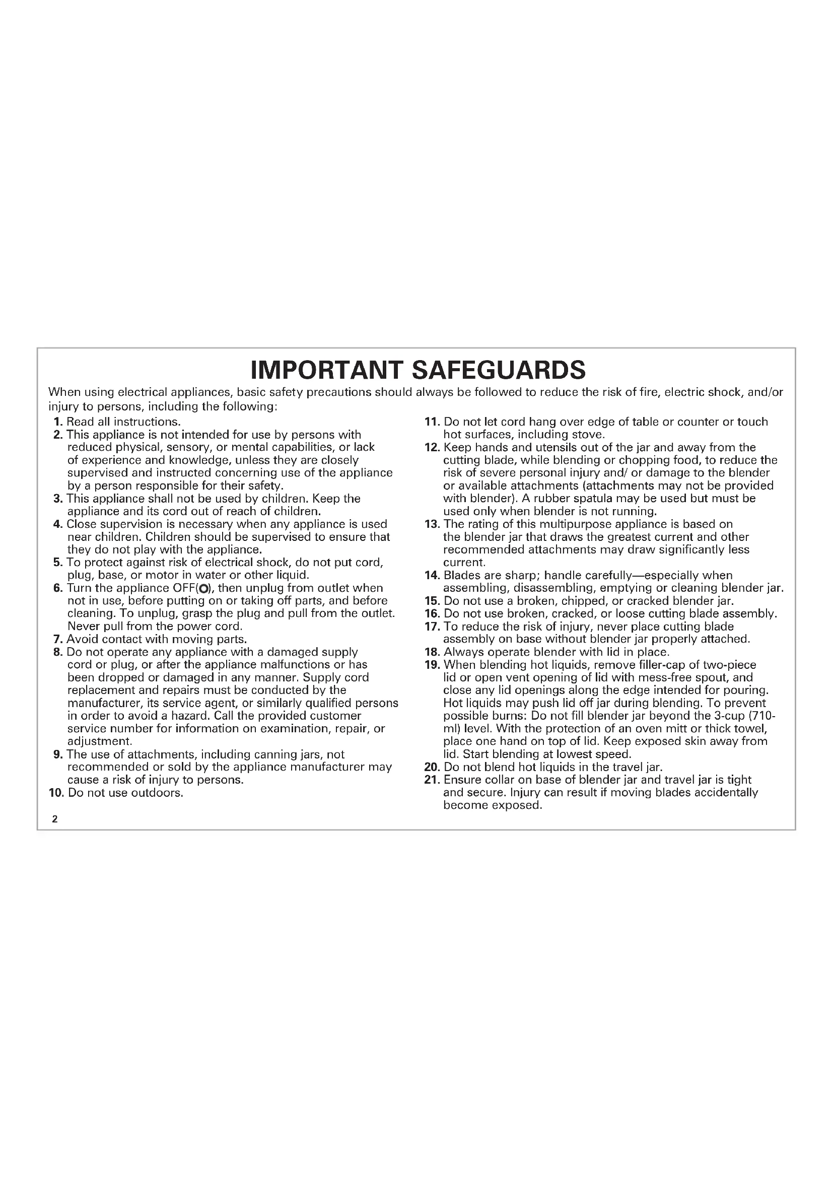 and secure. Injury can result if moving blades accidentally become exposed. When using electrical appliances, basic safety precautions should always be followed to reduce the risk of fire, electric shock, and/or injury to persons, including the following:3