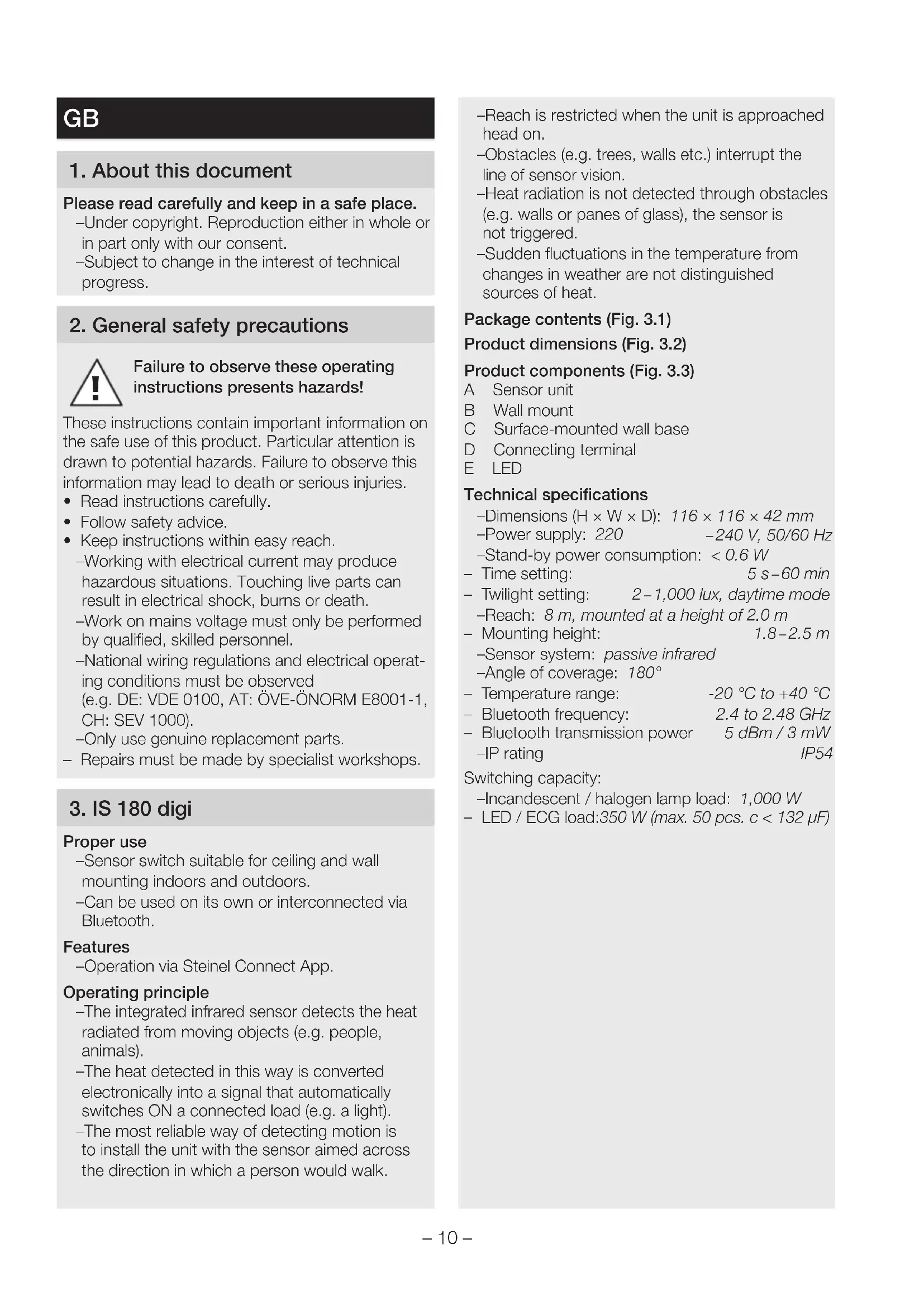 Proper use – Sensor switch suitable for ceiling and wall mounting indoors and outdoors. – Can be used on its own or interconnected via Bluetooth. Features – Operation via Steinel Connect App. Operating principle – The integrated infrared sensor detects the heat radiated from moving objects (e.g. people, animals). – The heat detected in this way is converted electronically into a signal that automatically switches ON a connected load (e.g. a light). – The most reliable way of detecting motion is to install the unit with the sensor aimed across the direction in which a person would walk. – Reach is restricted when the unit is approached head on. – Obstacles (e.g. trees, walls etc.) interrupt the line of sensor vision. – Heat radiation is not detected through obstacles (e.g. walls or panes of glass), the sensor is not triggered. – Sudden fluctuations in the temperature from changes in weather are not distinguished sources of heat. Package contents (Fig. 3.1) Product dimensions (Fig. 3.2) Product components (Fig. 3.3) A Sensor unit B Wall mount C Surface-mounted wall base D Connecting terminal E LED Technical specifications – Dimensions (H×W×D): 116×116×42mm – Power supply: 220 – 240V, 50/60Hz – Stand-by power consumption: <0.6W – Time setting: 5s – 60min – Twilight setting: 2 – 1,000lux, daytime mode – Reach: 8m, mounted at a height of 2.0 m – Mounting height: 1.8 – 2.5m – Sensor system: passive infrared – Angle of coverage: 180° – Temperature range: -20°C to +40°C – Bluetooth frequency: 2.4 to 2.48GHz – Bluetooth transmission power 5dBm/3mW – IP rating IP54 Switching capacity: – Incandescent / halogen lamp load: 1,000W – LED / ECG load: 350 W (max. 50 pcs. c < 132 µF)– 11 –