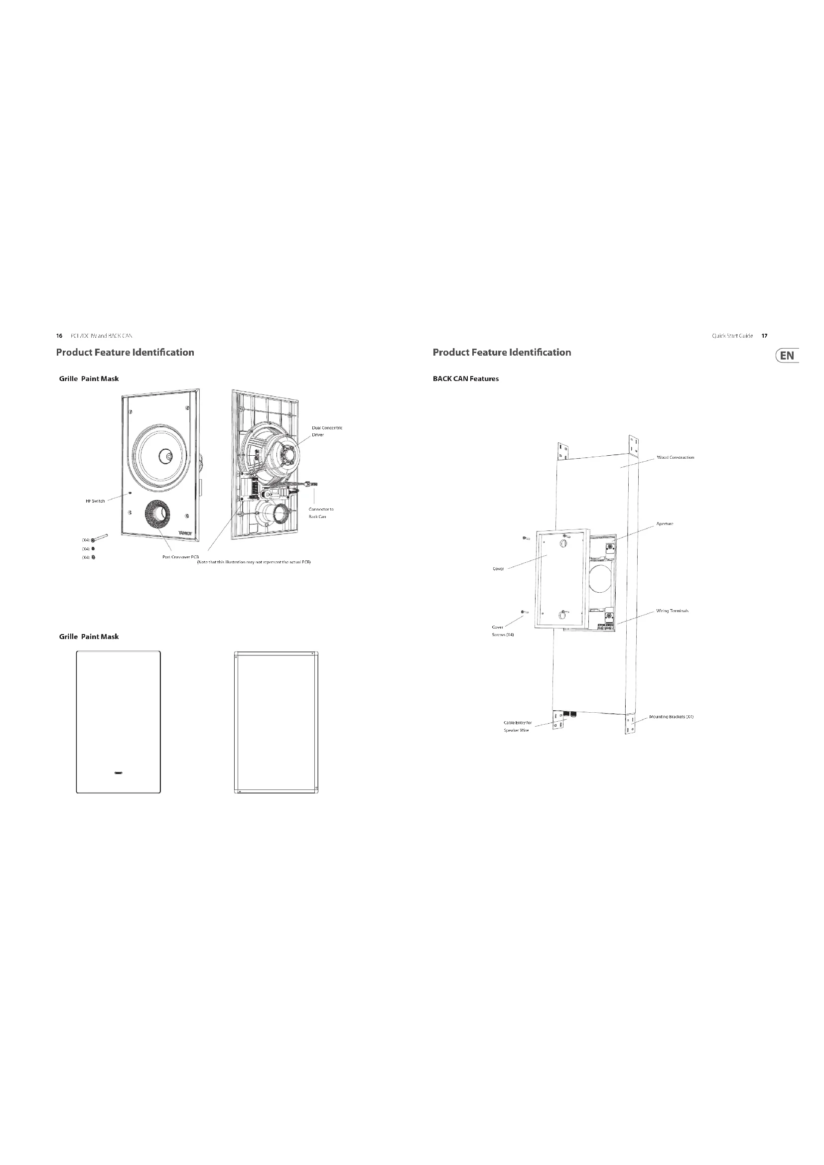 ood Construction Cover Aperture Wiring Terminals Cover Screws (X4)18 PCI 7DC IW and BACK CAN Quick Start Guide 19 Installation Guide BACK CAN Installation WARNING: This procedure requires the use of an assistant, and the use of personal protection equipment, such as safety glasses and gloves. WARNING: To avoid potential damage to your loudspeaker, ensure that the power ampliier is switched OFF prior to connecting or disconnecting any cables. WARNING: Make sure that there are no power lines, other cables, or plumbing such as water, sewer, gas lines in the chosen location. The procedure below describes the installation and wiring of the PCI 7DC IW back can into a typical 2" x 4" stud wall with 16" centers, with drywall/plasterboard not yet installed. After the back can and drywall is installed, the PCI 7DC IW speaker assembly can be connected to the back can wiring and installed, and the paint mask added during wall painting and finishing. Procedure Follow the procedure steps below in the order in which they are presented. Read all the instructions before starting.