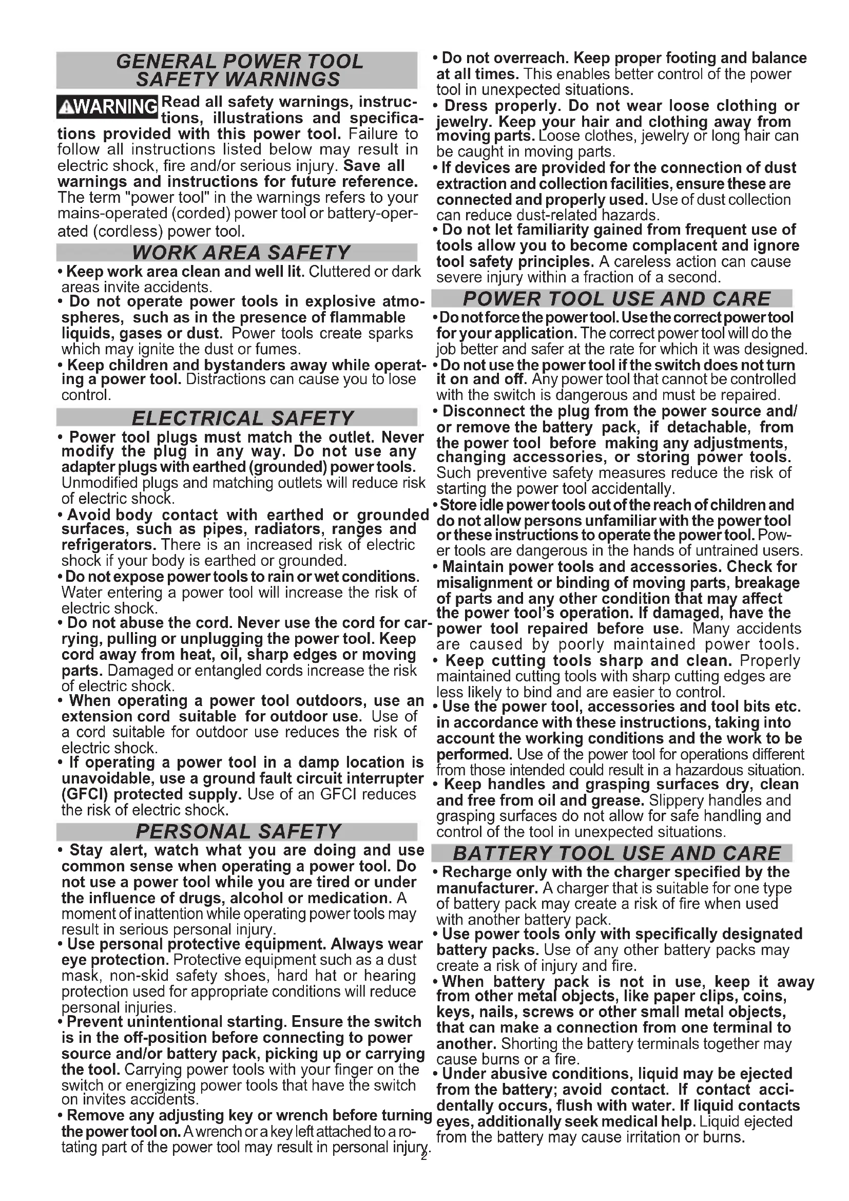 SAFETY WARNINGS WARNING Read all safety warnings, instruc- tions, illustrations and specica- tions provided with this power tool. Failure to follow all instructions listed below may result in electric shock, re and/or serious injury. Save all warnings and instructions for future reference. The term "power tool" in the warnings refers to your mains-operated (corded) power tool or battery-oper- ated (cordless) power tool.