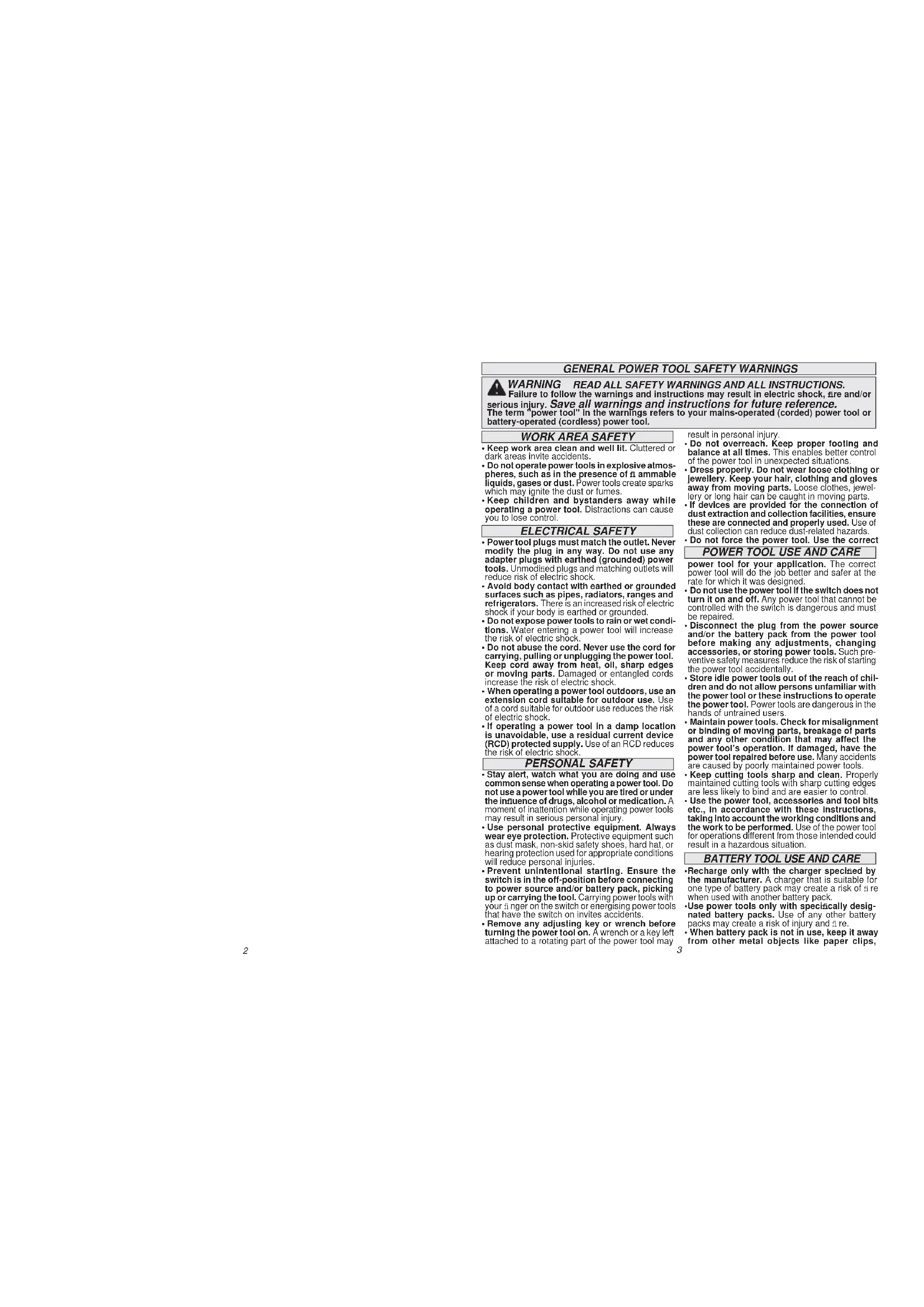 - Do not force the power tool. Use the correct WARNING READ ALL SAFETY WARNINGS AND ALL INSTRUCTIONS. Failure to follow the warnings and instructions may result in electric shock, fi re and/or serious injury. Save all warnings and instructions for future reference. The term "power tool" in the warnings refers to your mains-operated (corded) power tool or battery-operated (cordless) power tool.