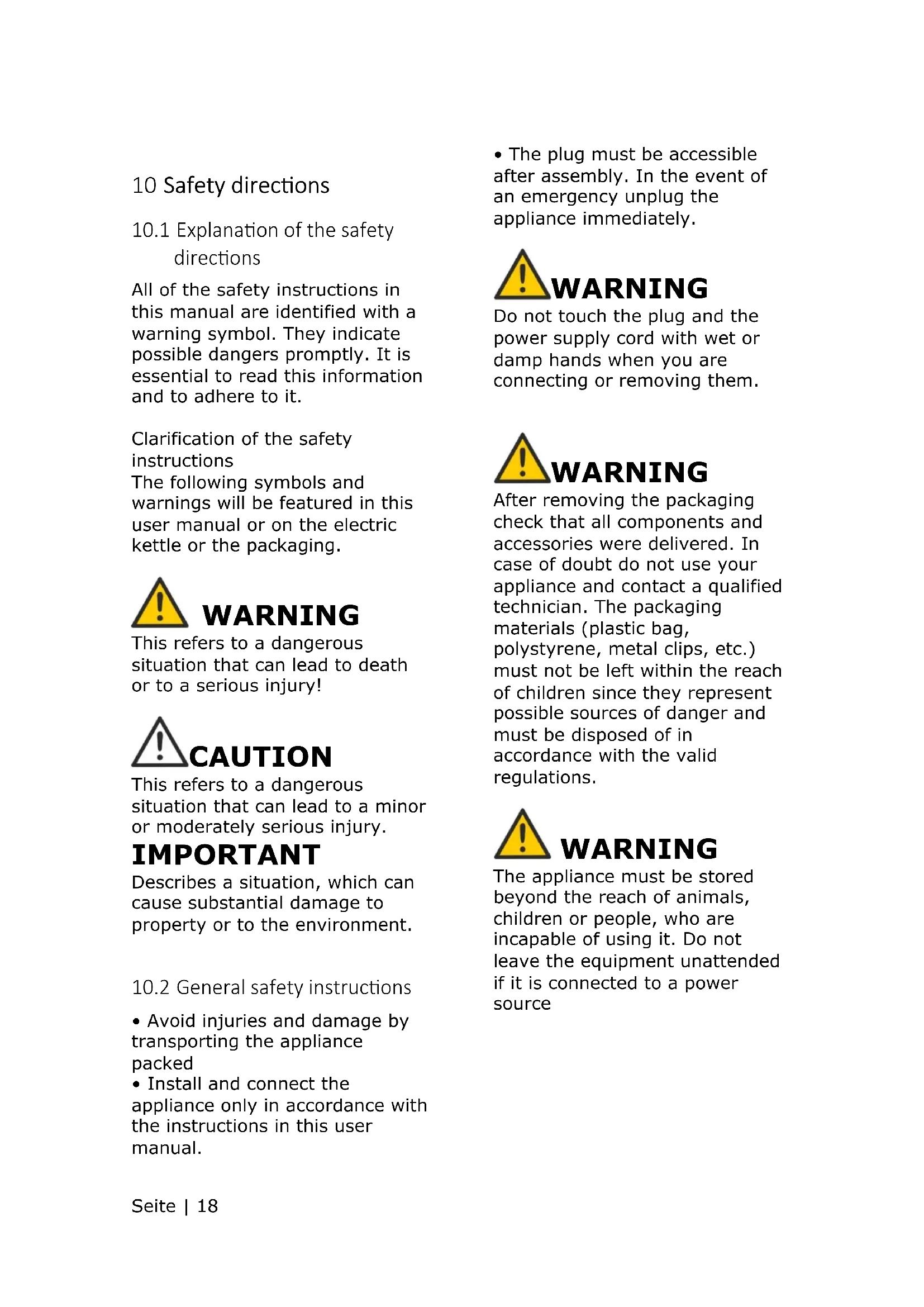 directions All of the safety instructions in this manual are identified with a warning symbol. They indicate possible dangers promptly. It is essential to read this information and to adhere to it. Clarification of the safety instructions The following symbols and warnings will be featured in this user manual or on the electric kettle or the packaging.