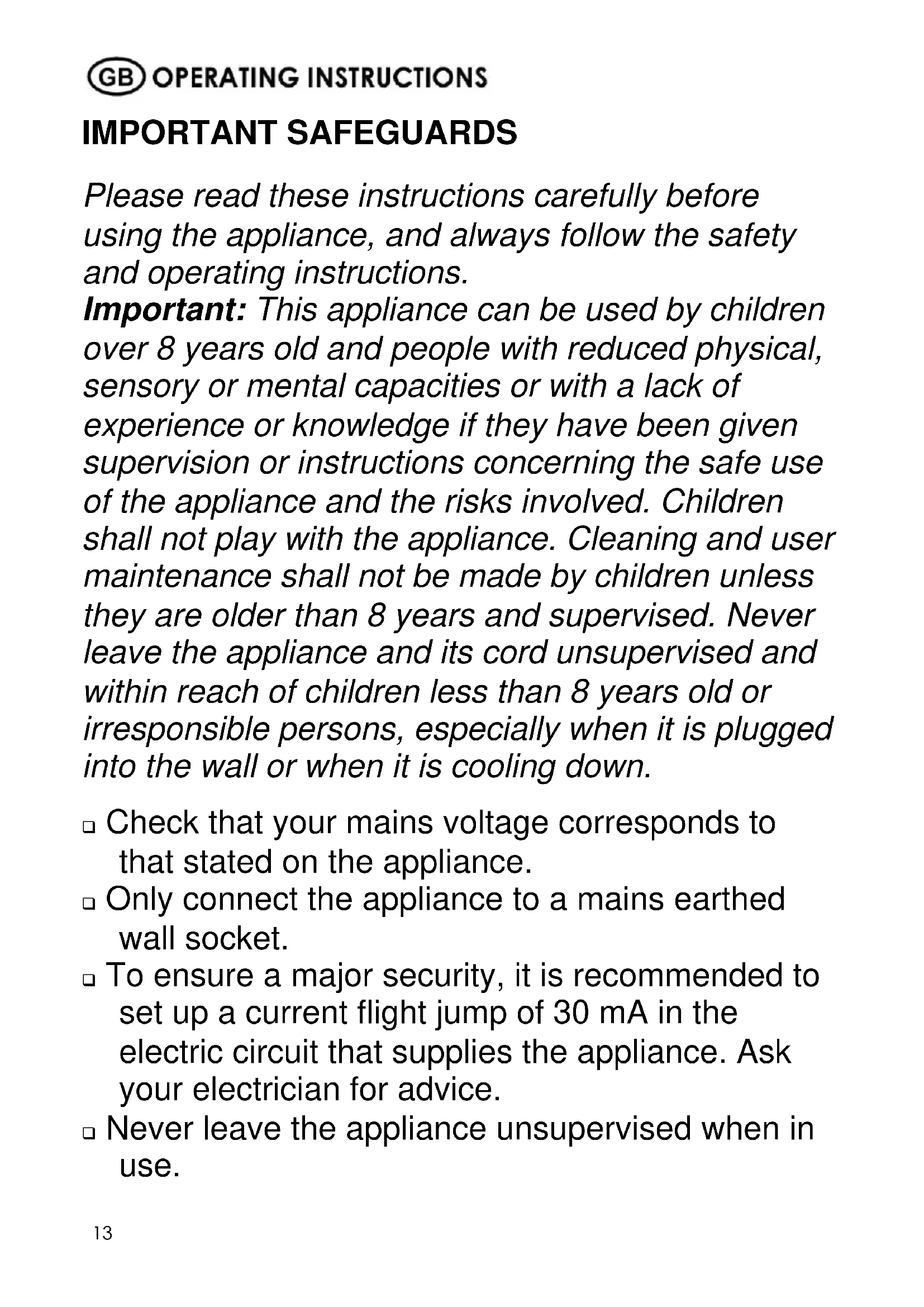 Important: This appliance can be used by children over 8 years old and people with reduced physical, sensory or mental capacities or with a lack of experience or knowledge if they have been given supervision or instructions concerning the safe use of the appliance and the risks involved. Children shall not play with the appliance. Cleaning and user maintenance shall not be made by children unless they are older than 8 years and supervised. Never leave the appliance and its cord unsupervised and within reach of children less than 8 years old or irresponsible persons, especially when it is plugged into the wall or when it is cooling down.