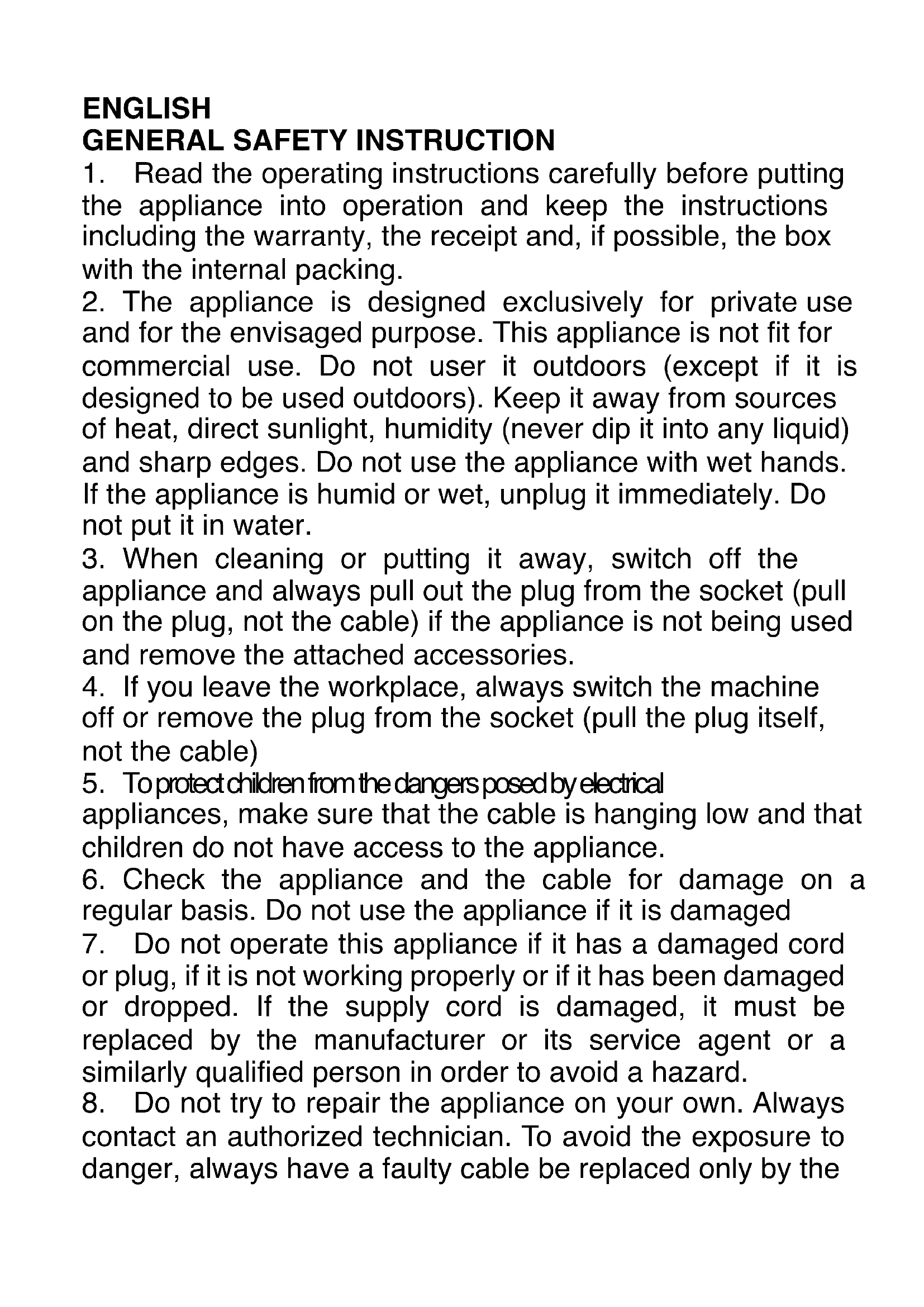- The appliance is designed exclusively for private use and for the envisaged purpose. This appliance is not fit for commercial use. Do not user it outdoors (except if it is designed to be used outdoors). Keep it away from sources of heat, direct sunlight, humidity (never dip it into any liquid) and sharp edges. Do not use the appliance with wet hands. If the appliance is humid or wet, unplug it immediately. Do not put it in water.