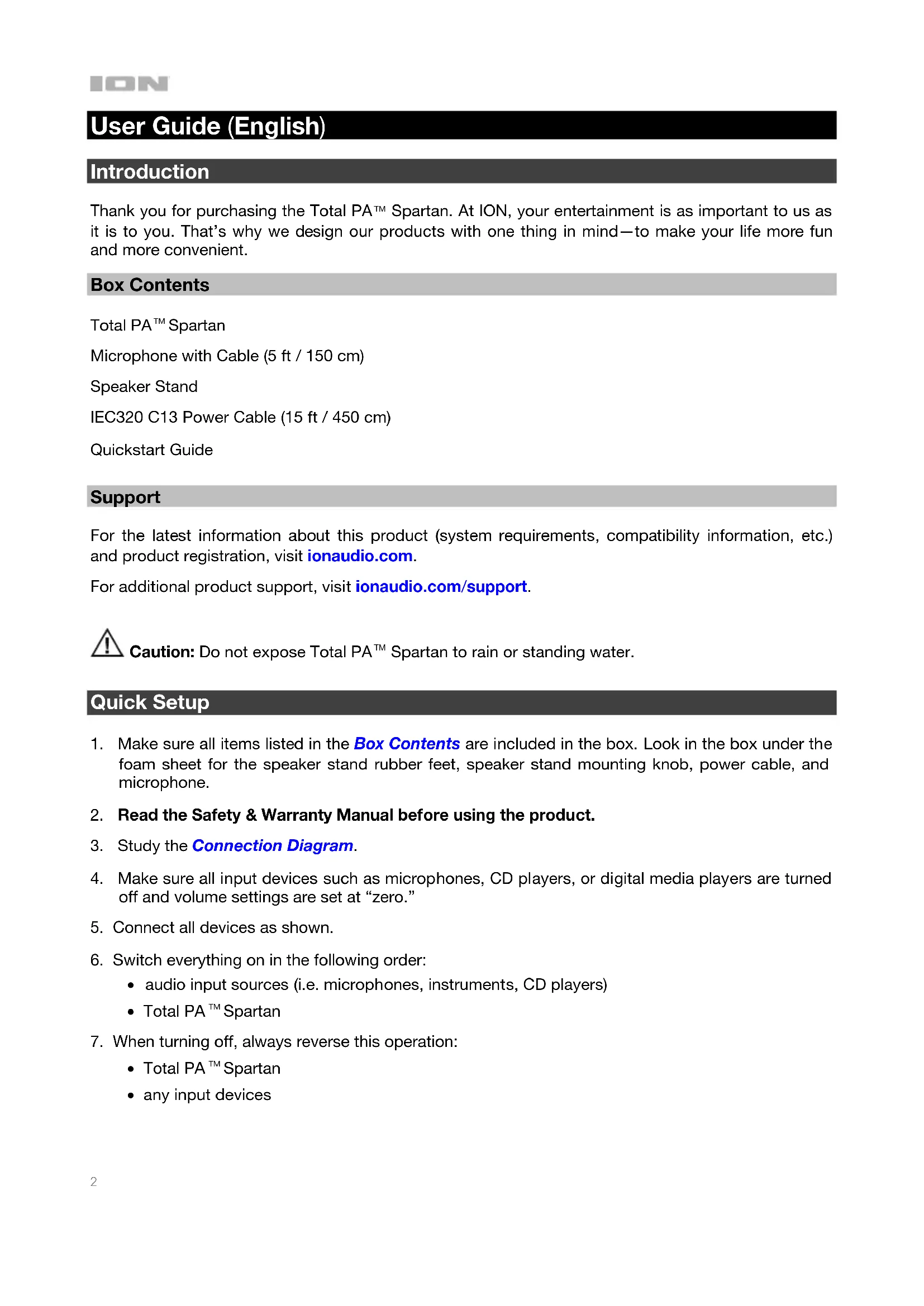 Spartan. At ION, your entertainment is as important to us as it is to you. That’s why we design our products with one thing in mind—to make your life more fun and more convenient. Box Contents Total PA
