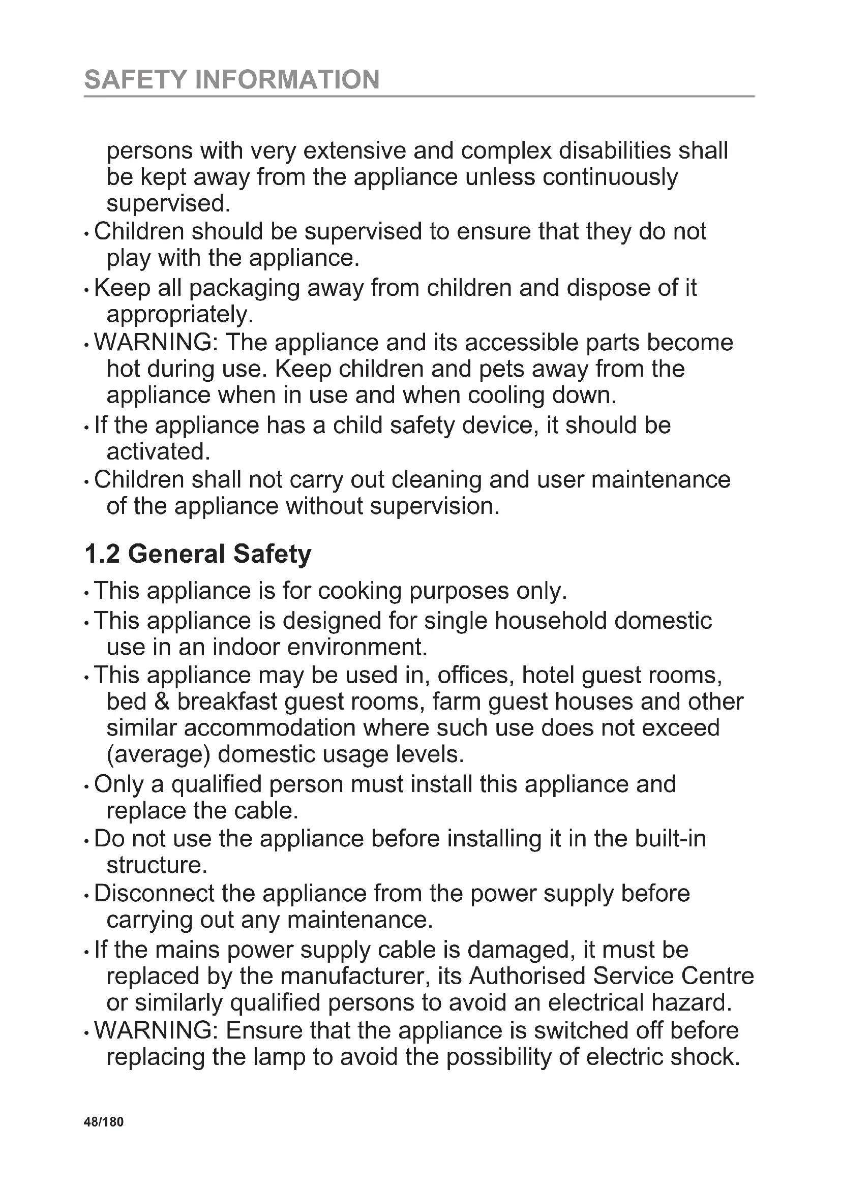 - WARNING: Ensure that the appliance is switched off before replacing the lamp to avoid the possibility of electric shock. 48/180 SAFETY INFORMATION• WARNING: The appliance and its accessible parts become hot during use. Care should be taken to avoid touching heating elements or the surface of the appliance cavity.