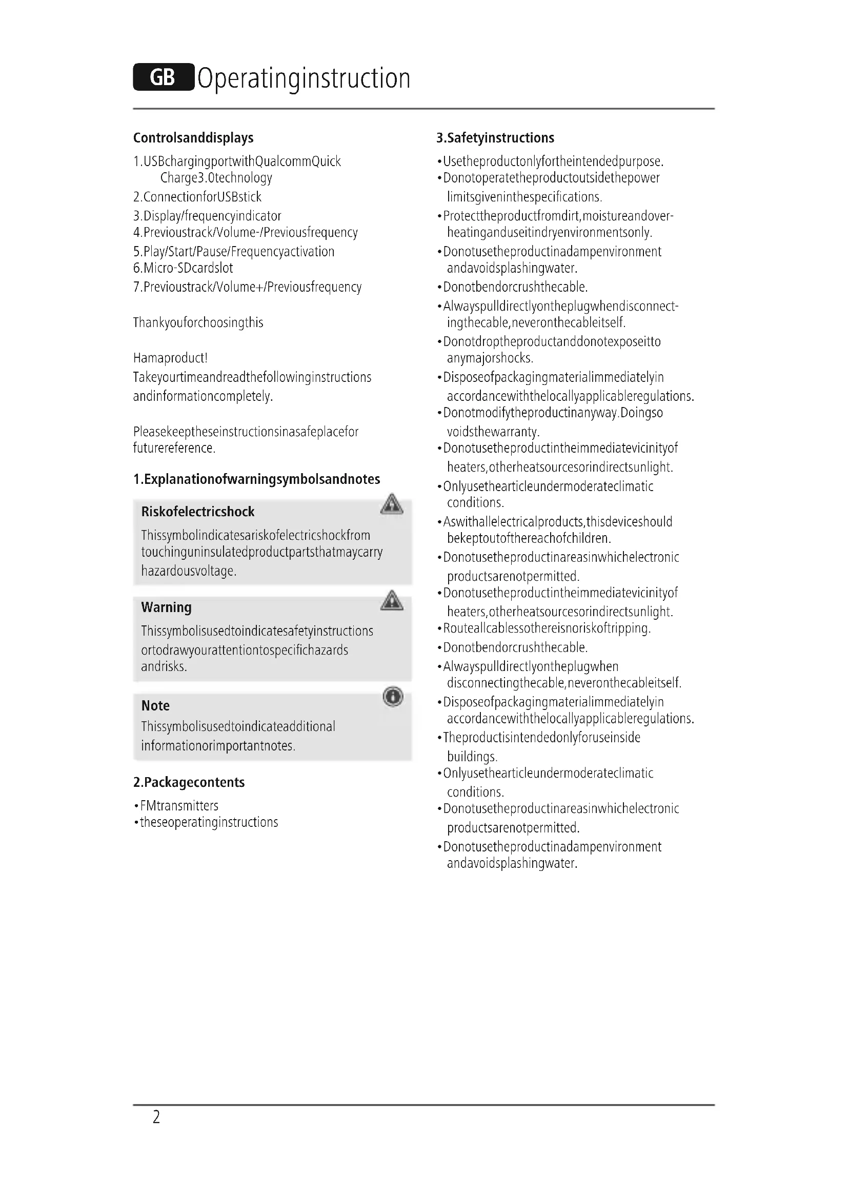 Download the instructions for your FM Transmitter in PDF format for free! Find your manual 00201631 - HAMA and take your electronic device back in hand. On this page are published all the documents necessary for the use of your device. 00201631 by HAMA.