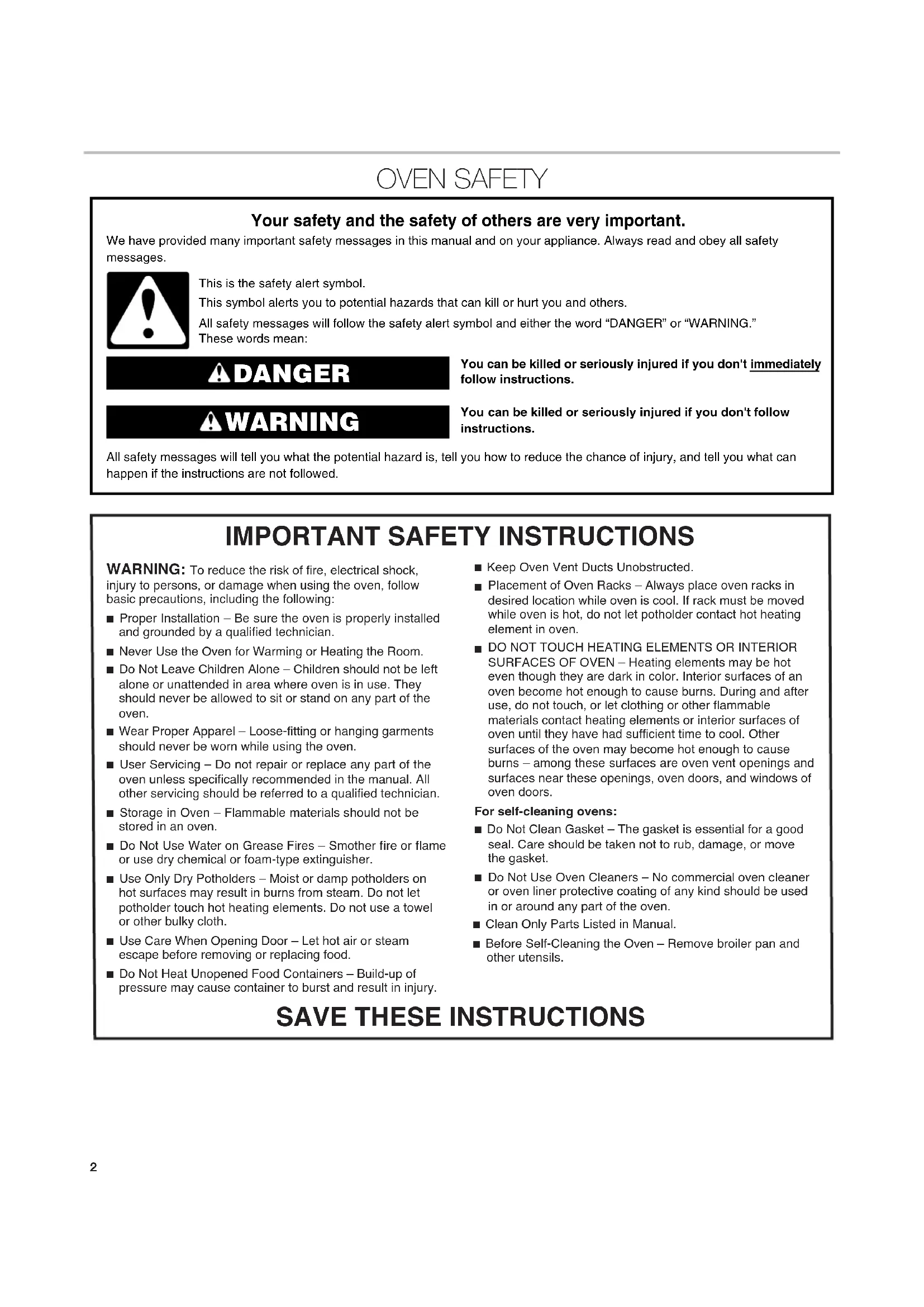 OVEN SAFETY You can be killed or seriously injured if you don't immediately You can be killed or seriously injured if you don'tfollow All safety messages will tell you what the potential hazard is, tell you how to reduce the chance of injury, and tell you what can happen if the instructions are not followed. Your safety and the safety of others are very important. We have provided many important safety messages in this manual and on your appliance. Always read and obey all safety messages.This is the safety alert symbol.This symbol alerts you to potential hazards that can kill or hurt you and others.All safety messages will follow the safety alert symbol and either the word “DANGER” or “WARNING.”These words mean:follow instructions.instructions. DANGER WARNING