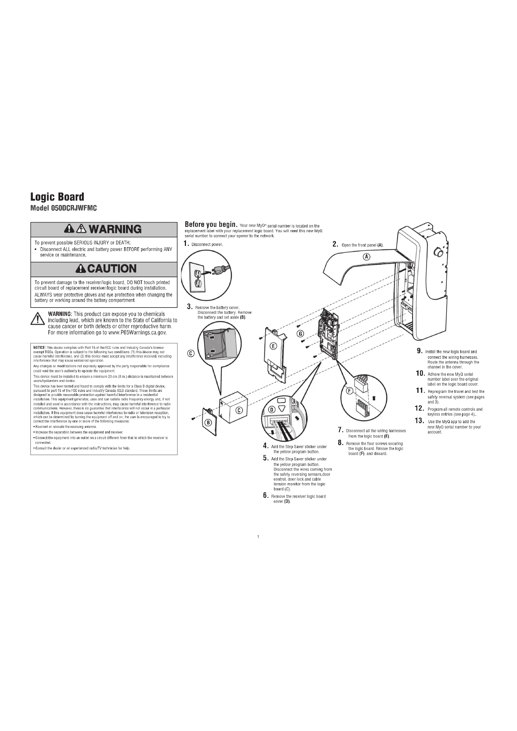 3. Remove the battery cover. Disconnect the battery. Remove the battery and set aside (B). 4. Add the Step Saver sticker under the yellow program button. 5. Add the Step Saver sticker under the yellow program button. Disconnect the wires coming from the safety reversing sensors,door control, door lock and cable tension monitor from the logic board (C). 6. Remove the receiver logic board cover (D). 7. Disconnect all the wiring harnesses from the logic board (E). 8. Remove the four screws securing the logic board. Rmove the logic board (F), and discard. 9. Install the new logic board and connect the wiring harnesses. Route the antenna through the channel in the cover. 10. Adhere the new MyQ serial number label over the original label on the logic board cover. 11. Reprogram the travel and test the safety reversal system (see pages and 3).
