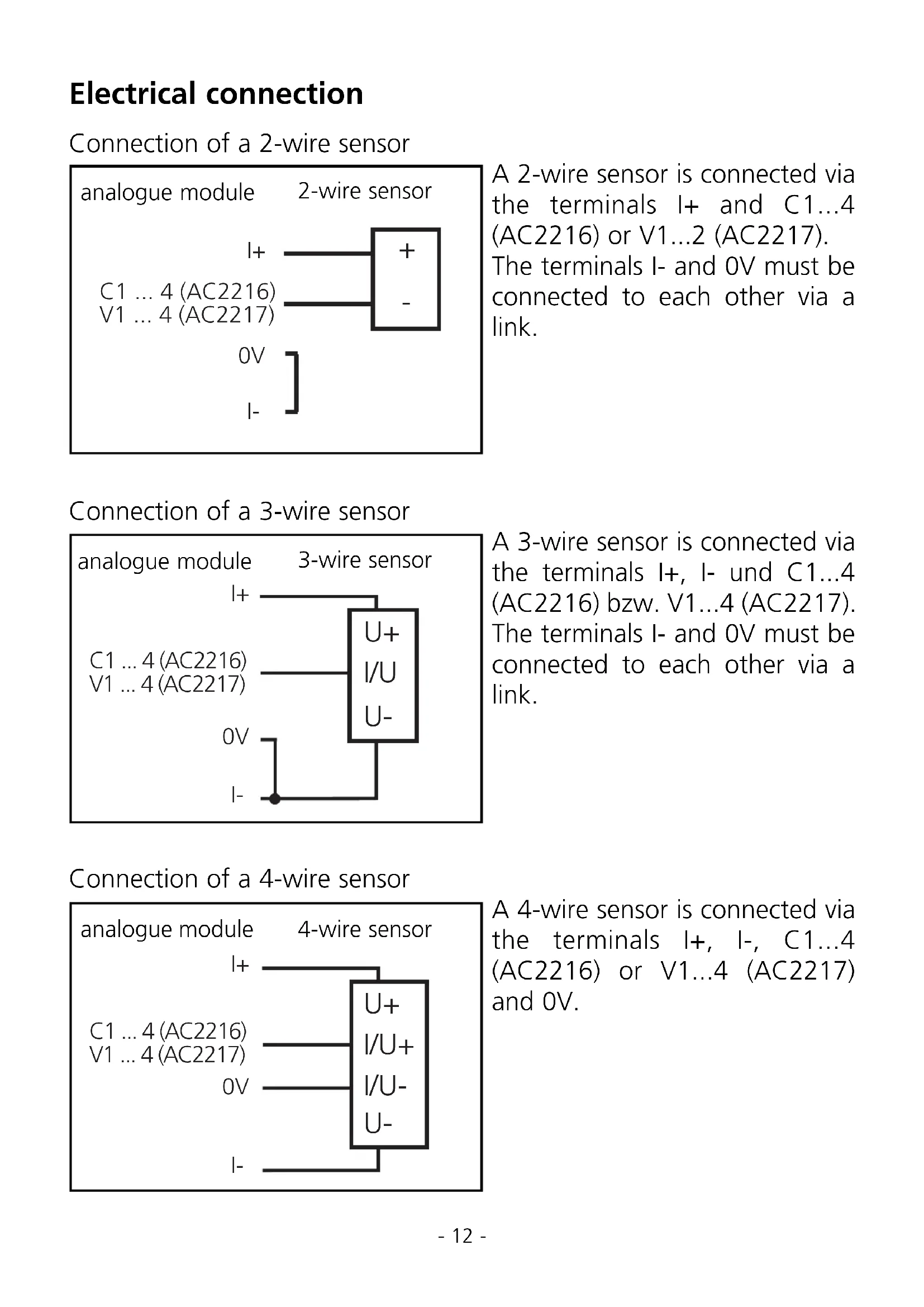 A 3-wire sensor is connected via the terminals I+, I- und C1...4 (AC2216) bzw. V1...4 (AC2217). The terminals I- and OV must be connected to each other via a link.