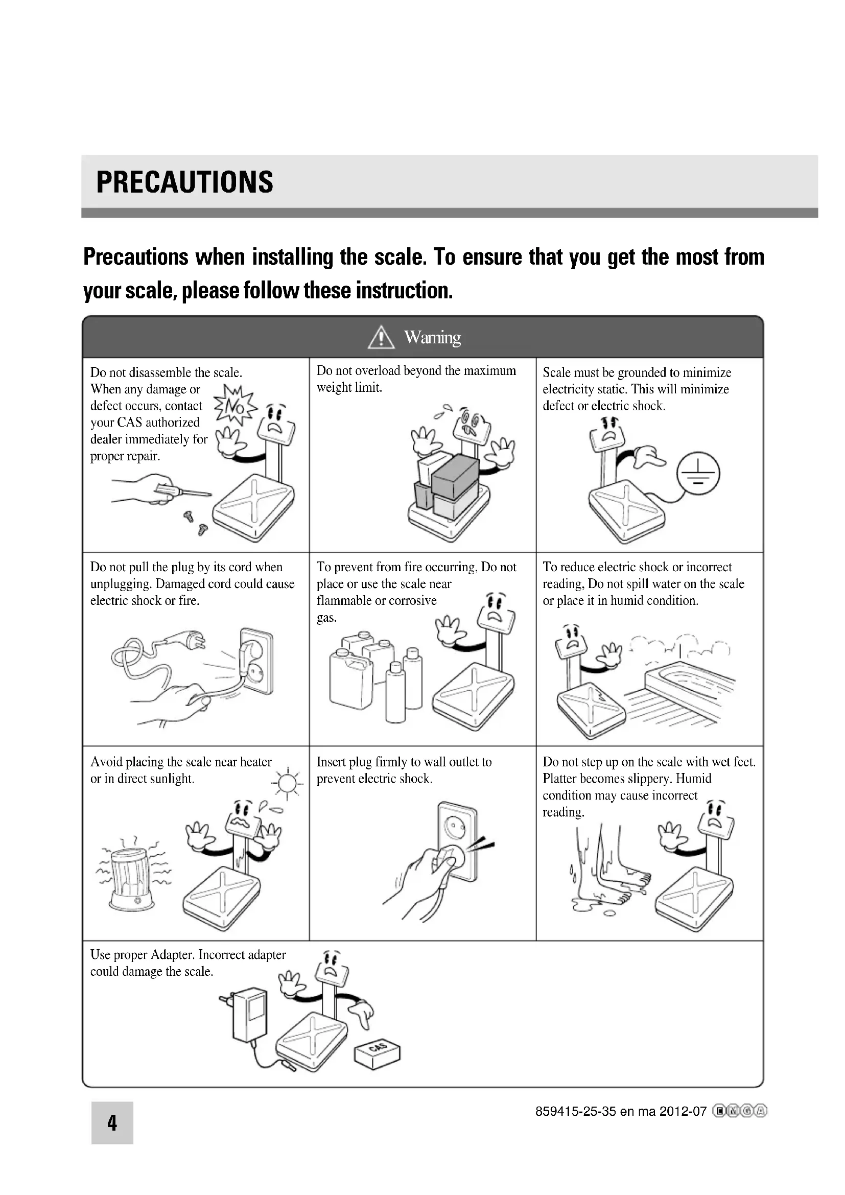 | Do not disassemble the scale. When any damage or defect occurs, contact your CAS authorized dealer immediately for proper repair. | Do not overload beyond the maximum weight limit. | Scale must be grounded to minimize electricity static. This will minimize defect or electric shock. |